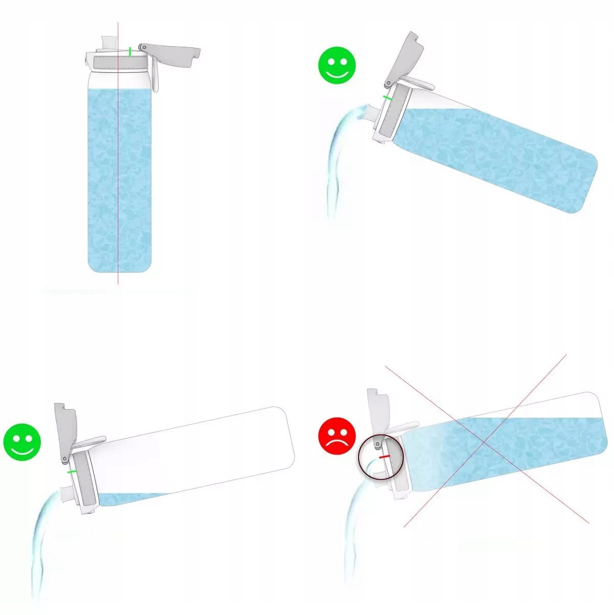 Наша пляшка для напоїв на 100% герметична та негерметична. Після закриття м’який силікон повністю закриває мундштук і вентиляційний отвір. Захисний замок запобігає випадковому відкриттю під час носіння в сумці чи рюкзаку.