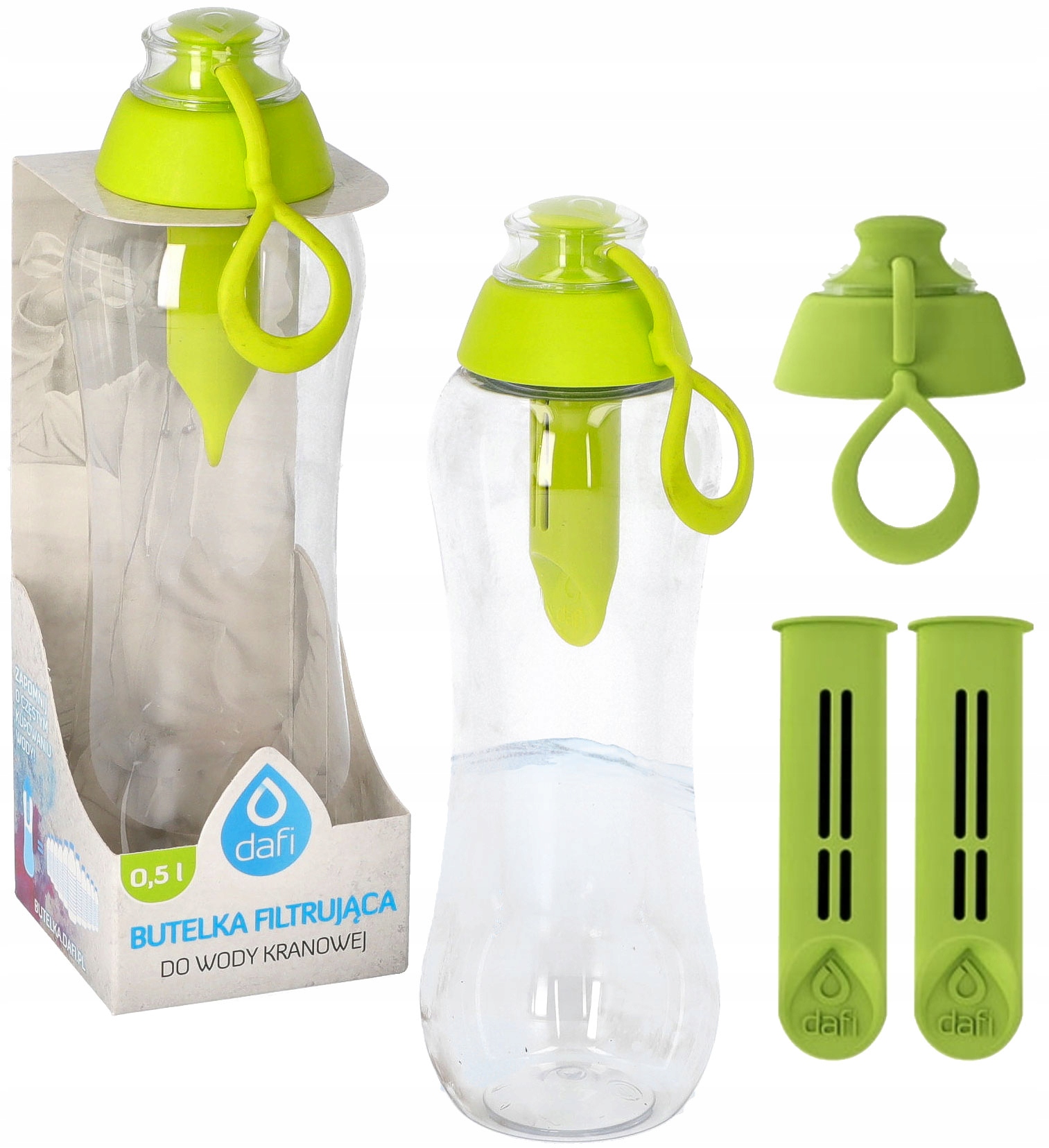 Зручна багаторазова пляшка обладнана вугільним фільтром, який замінюють щомісяця. Виготовлений з міцного пластику. Він повністю вільний від шкідливого бісфенолу А та дозволений для контакту з водою на основі відповідних сертифікатів.