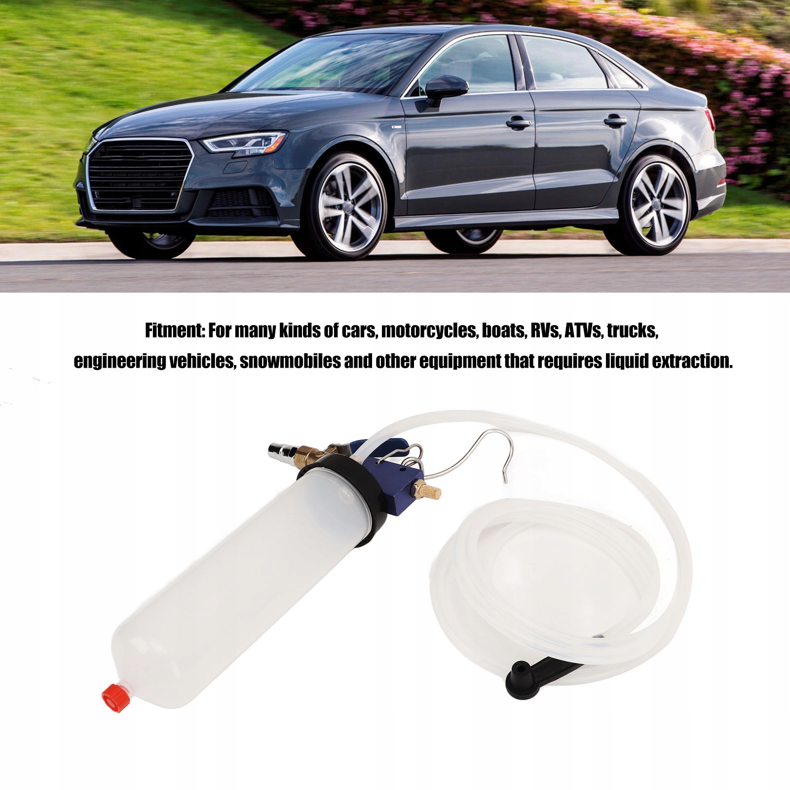 1. Широке застосування: інструмент заміни пневматичної гальмівної рідини підходить для автомобілів, мотоциклів, човнів, кемпінгових транспортних засобів, квадроциклів, вантажних автомобілів, інженерних транспортних засобів, скутерів снігоходів та іншого обладнання, яке потребує вилучення рідини.