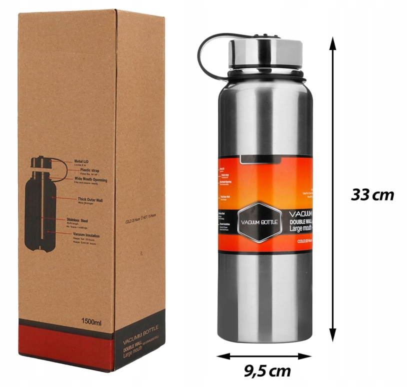 Термос з нержавіючої сталі, 1,5 л, вакуумна ізоляція, герметична, подвійна стінка, спортивна, срібляста