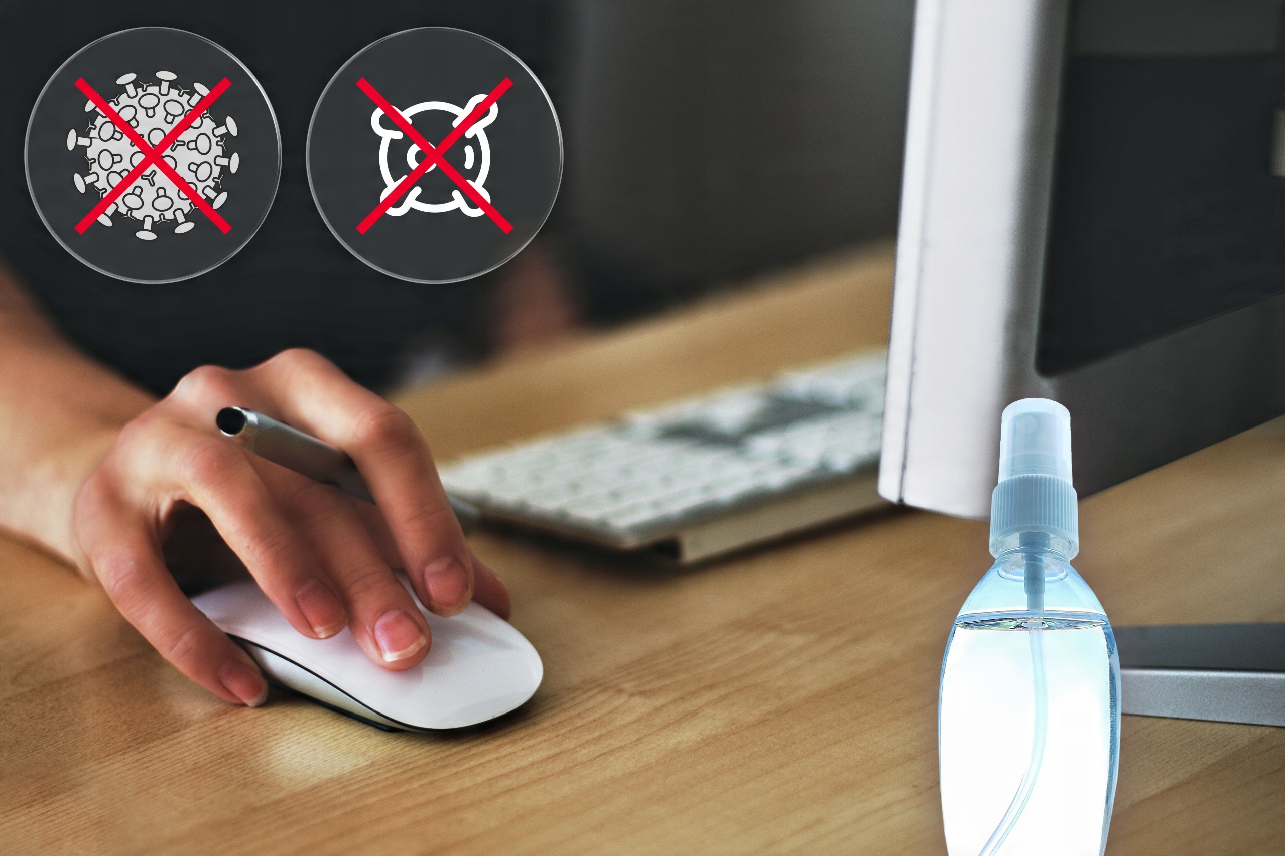 Перед початком роботи продезінфікуйте своє робоче місце. Розпиліть препарат на клавіатуру, мишу або офісне обладнання, наприклад ручки, степлери, швидкозшивачі тощо.