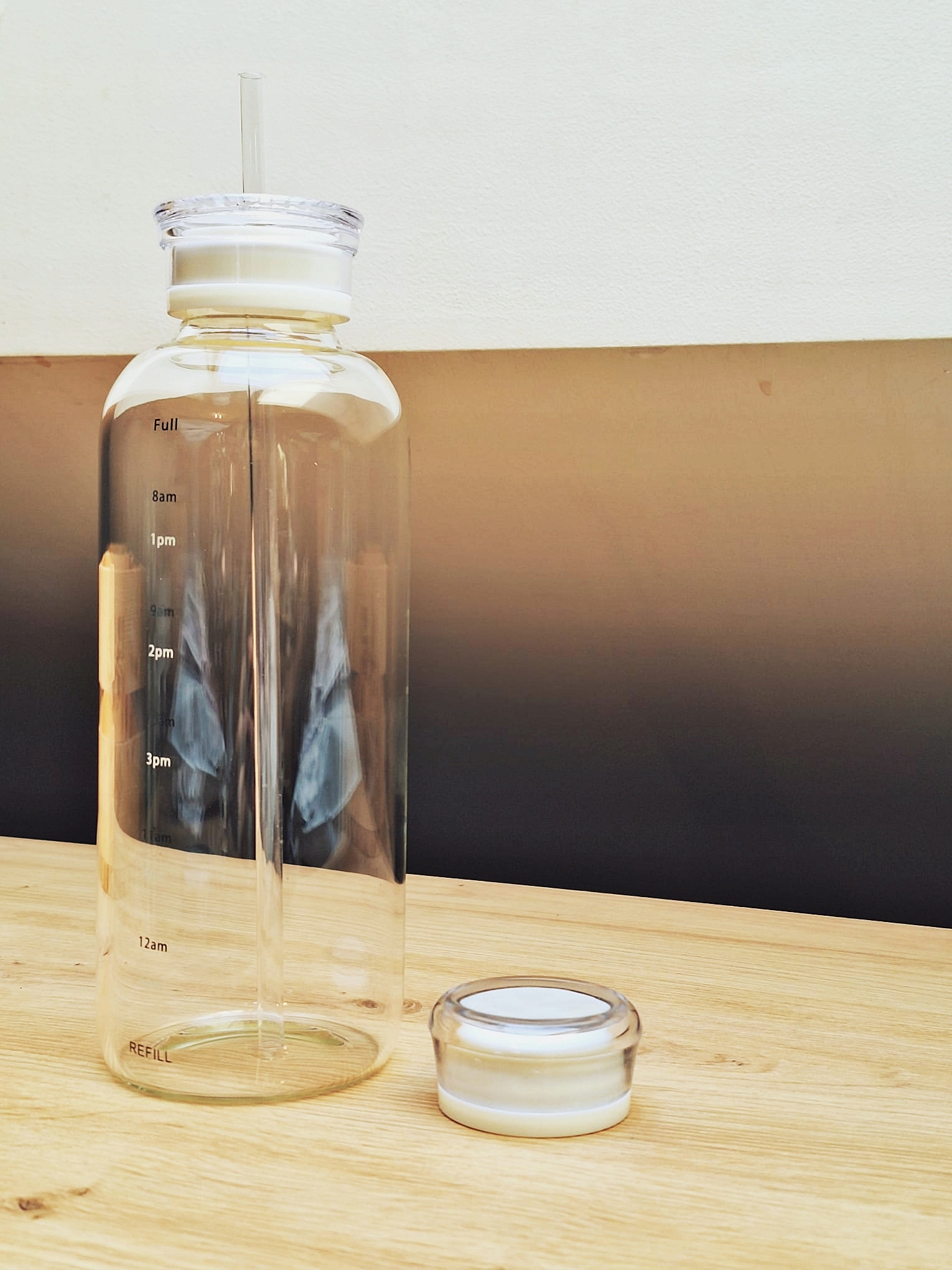 Стильна скляна пляшка, яка завдяки потужності до 750 мл, подбає про вашу гідратацію під час фізичних вправ, на роботі або на подорожі. Вам, безумовно, сподобається його прозорий колір, який доповнює індикатор споживання води. У пляшці є солома для вибору (пластик), що зручно пити.
