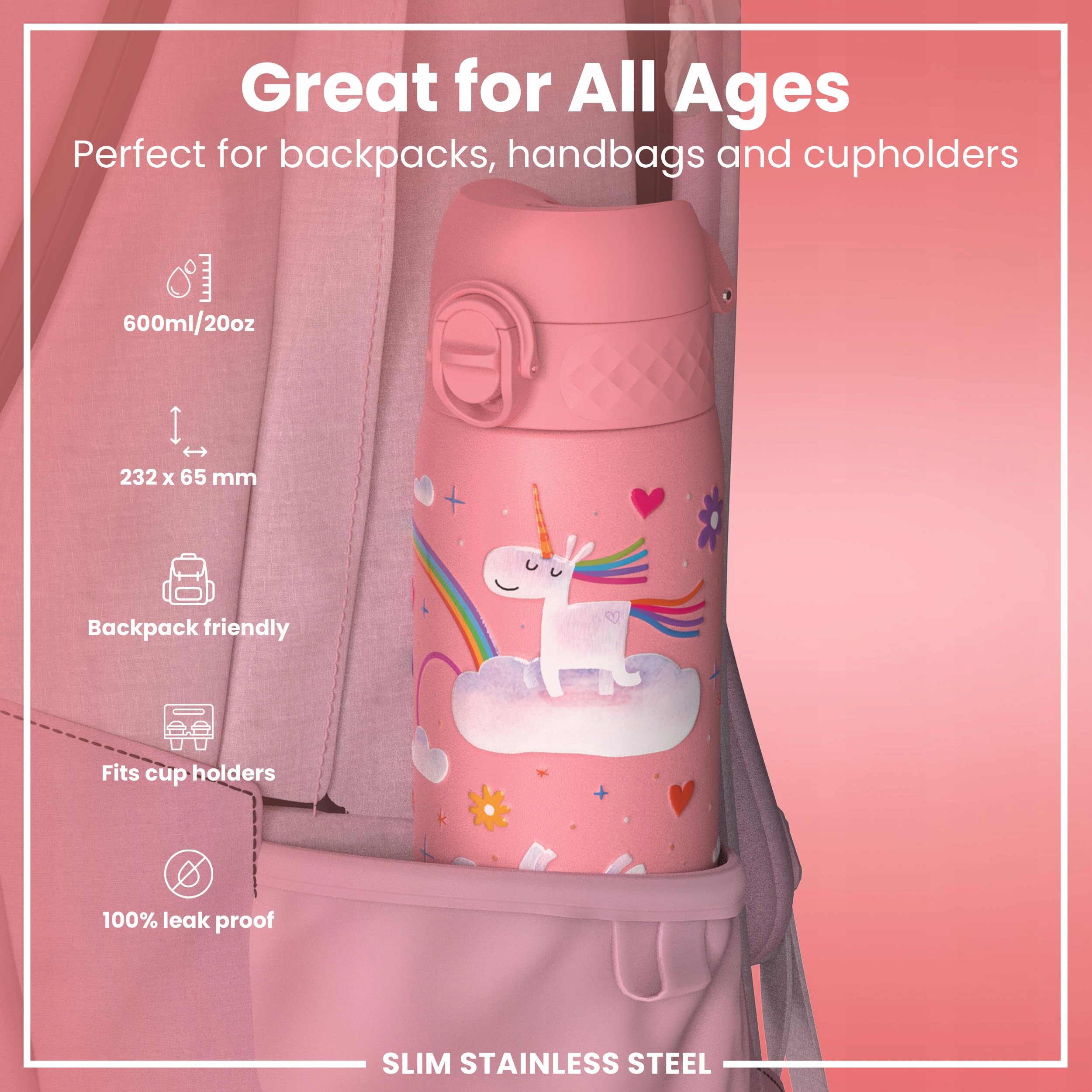 Пляшка з легкою сталевою водою Ion8, 600 мл/20 унцій, неізольована, захищена від витоку, простий у відкритті, безпечний замок, безпечний посудомийна машина, фліп-кришка, підходить до чашок, рукоятка, металева пляшка з водою, велосипеди з єдиноріг 2>