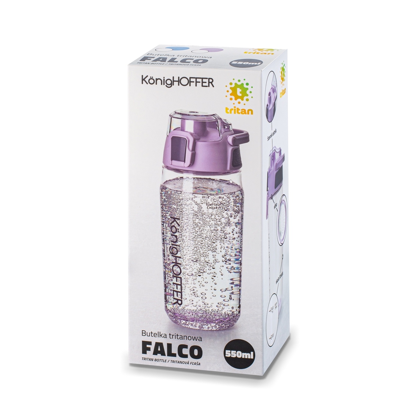 Фіолетова пляшка води Falco Falco змусить вас рухатися і вирушити! З такою пляшкою та до 550 мл улюбленого напою ви відчуєте більше однієї пригоди. Ви також подбаєте про свій комфорт та приємний смак. Модель - Tritan, а це означає, що дуже довговічна і без BPA. Більше того, у нього є кристалічне тіло, як склянку, стійке до подряпин та раптових змін температури. Він був створений для активних людей - для дитини до школи, практики, занять спортом, ходьбою. Продукт має щільне закриття з додатковим замком, тому він не відкриється в рюкзаку. Комфортне гасіння спраги забезпечує широкий мундштук. У такій пляшці з багаторазовим використанням ви навіть візьмете з собою свіжий лимонад. Всередині є знімний ситечко, який зупинить фруктові та м'яти листя, коли ви будете робити ще один ковток. Це якраз вчасно для коктейлів, поживних речовин для спортсменів та пити льстен - масштаб літра полегшить вимірювання інгредієнтів. Проста конструкція моделі пов'язана з безпроблемним доглядом. У ньому навіть є власник, що перевозить!