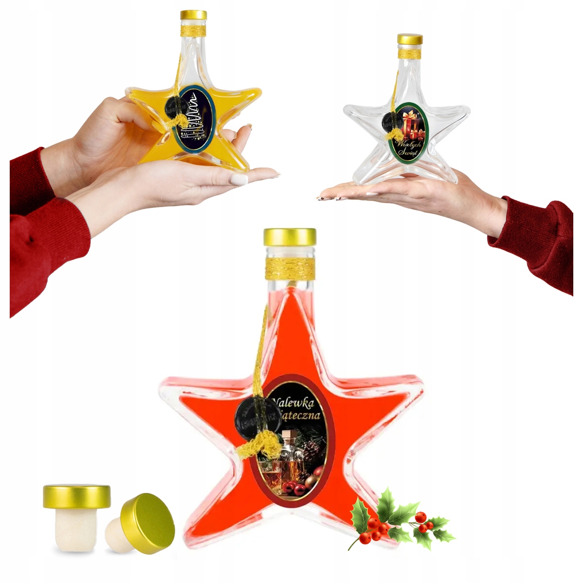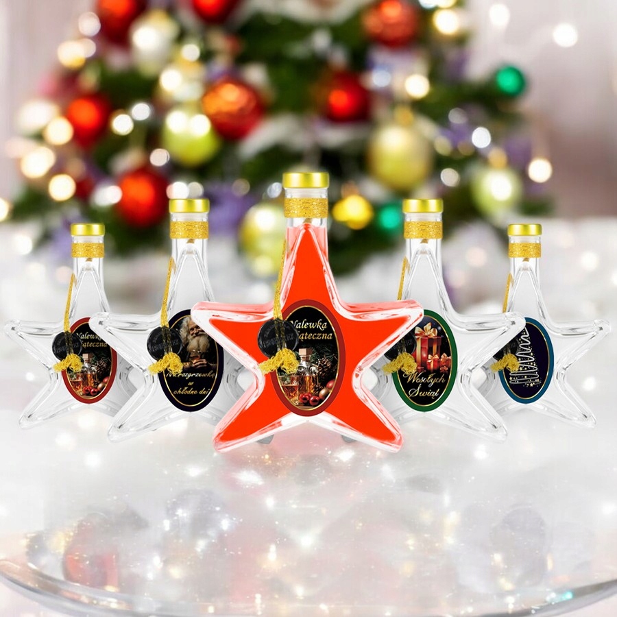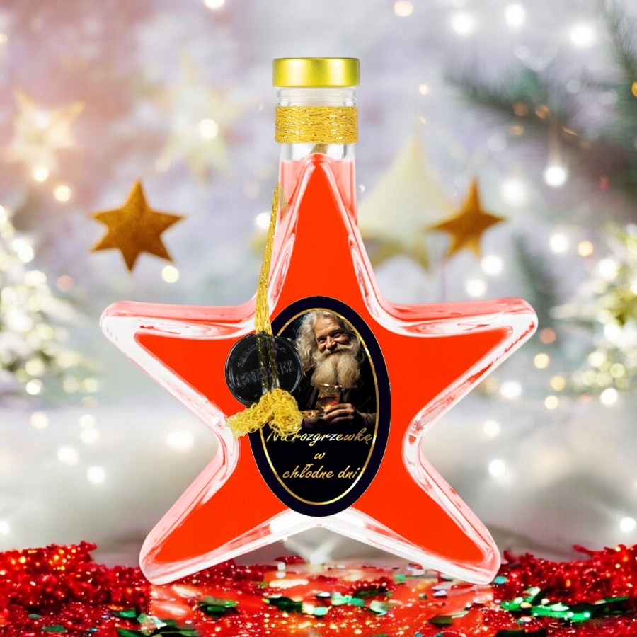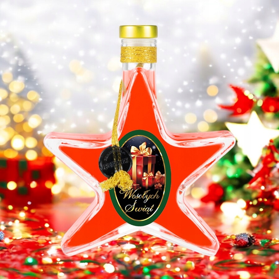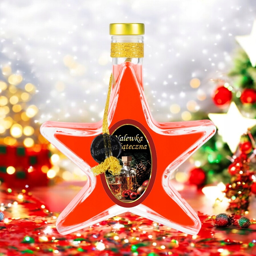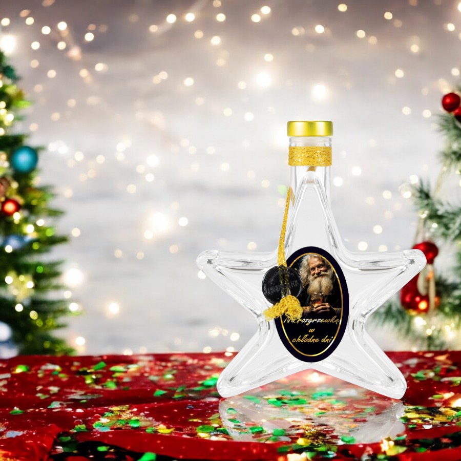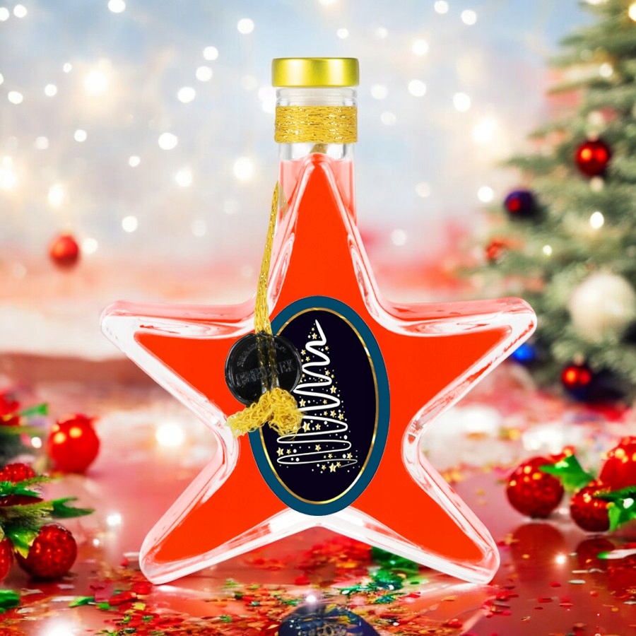 Надайте своїм настоянкам і лікерам унікальний характер за допомогою цієї чудової пляшки у формі зірки, прикрашеної вручну. Оригінальний дизайн і ретельна робота роблять пляшку не тільки практичною упаковкою, але й прикрасою, яка приверне увагу на кожному столі, особливо під час Різдва. Пляшка, прикрашена золотою стрічкою та унікальною етикеткою, яка асоціюється з теплом і магією Різдва, чудово вписується в атмосферу холодних зимових днів.