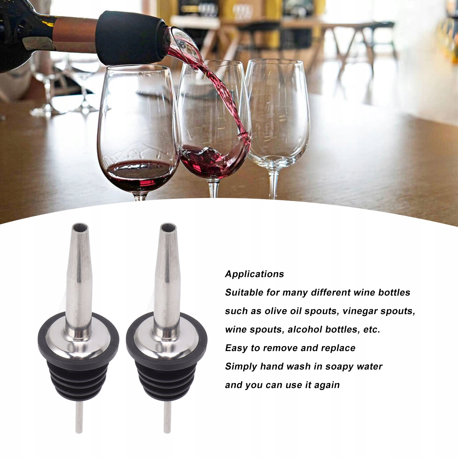 4. Застосування: носик для розливу алкоголю підходить для багатьох різних пляшок, таких як носик для оливкової олії, оцту, вина, пляшок для алкоголю тощо.