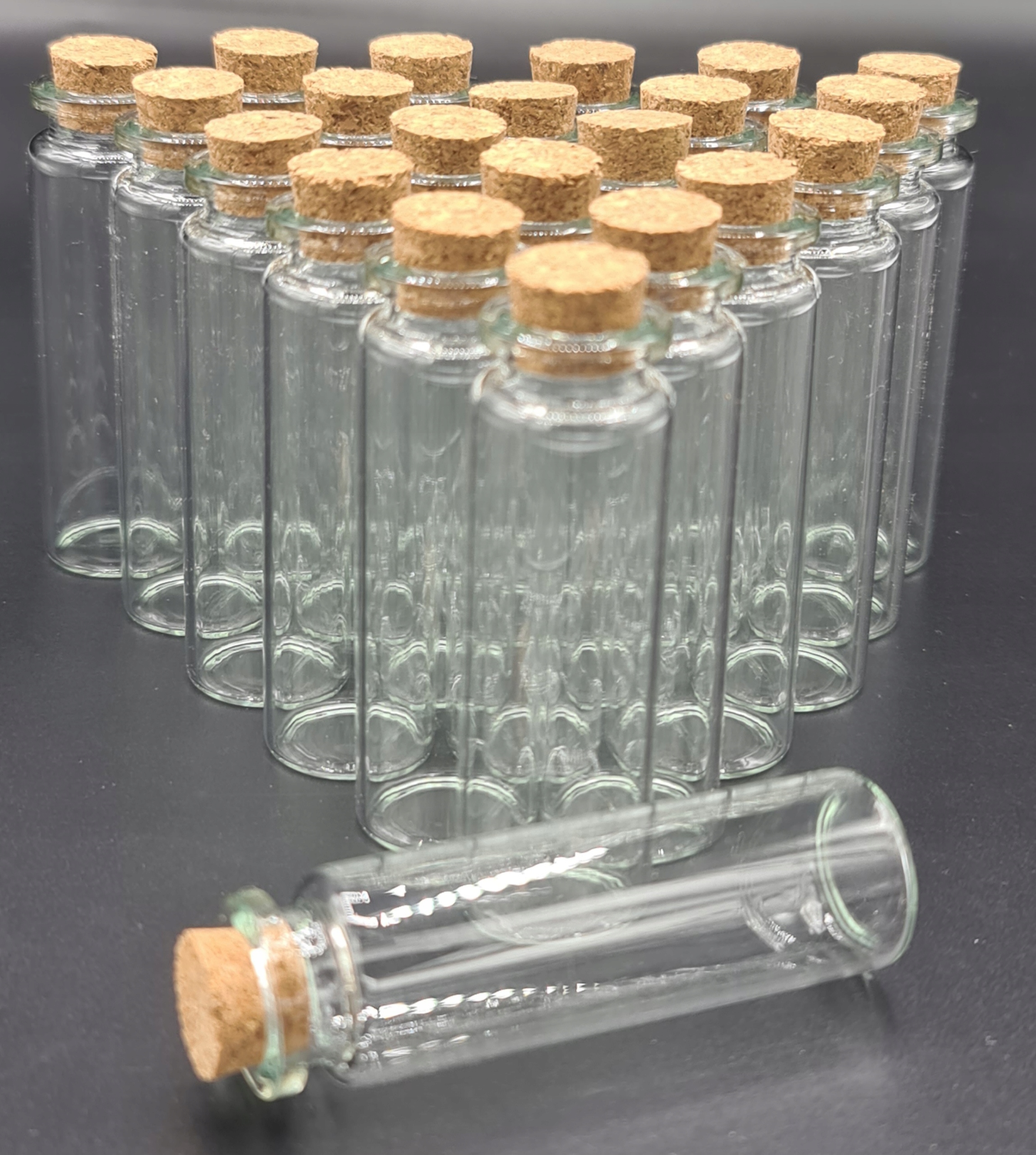 Набір із 60 скляних, прозорих пляшок з пробками.