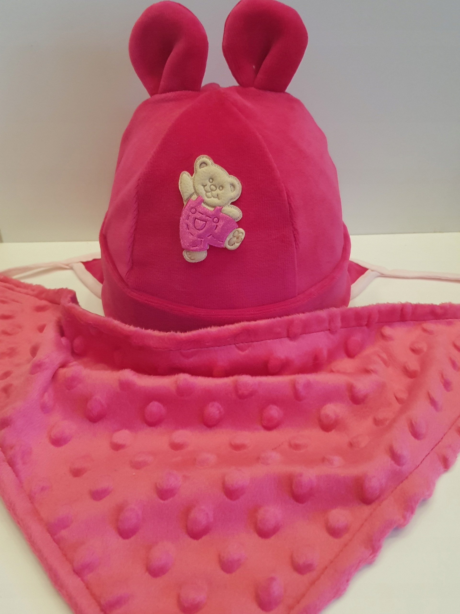 Набір - солодкий плюшевий ведмедик, виготовлений з м'якого велюру, з кумедними вухами для дівчинки та хлопчика плюс шарф у вигляді серветки з липучки від 0 до 12 місяців у 6 наймодніших кольорах. Доступні розміри 0-1, 1-3, 3-6, 6-9, 9-12 місяців. Після покупки надайте вік та колір дитини (аукціон застосовується до 1 набору). Ми також запрошуємо вас на всі наші аукціони, де доступні лише шапки та набори з рукавичками та іншими шапками, головними уборами, хустками, шарфами, смугами та іншими предметами для новонароджених, немовлят та дітей прямо від виробника.