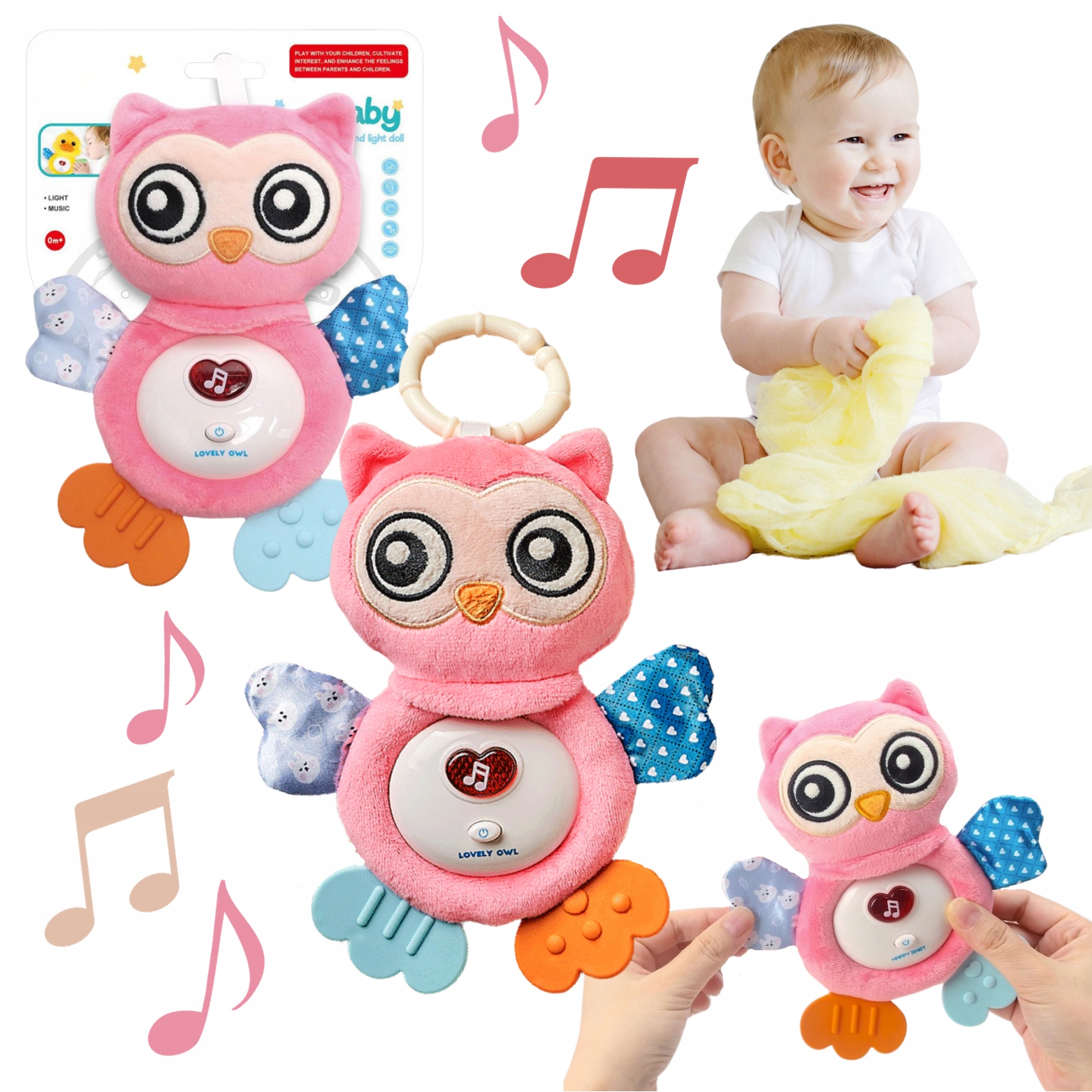 Іграшка має два зуби , які принесуть вашому малюкові весело, а також допоможуть під час прорізування зубів. Сову можна легко прикріпити до візки, автокрісла або ліжечка, завдяки якому вона може супроводжувати вашу дитину скрізь. різні текстури Матеріал, з якого виготовляється сова, розвивають почуття дитини. зворушливий, кусання та веселощі стимулює розвиток сенсорних навичок.