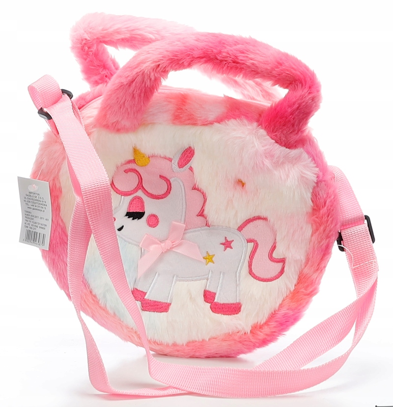 Красива напівкругла сумка з єдинорогом, цілком плюшева та м’яка, з регульованим ремінцем. Застібається на рожеву блискавку. Одне відділення всередині.