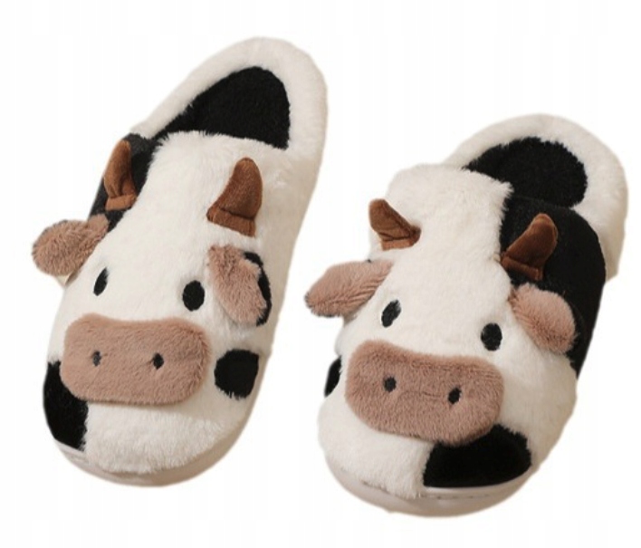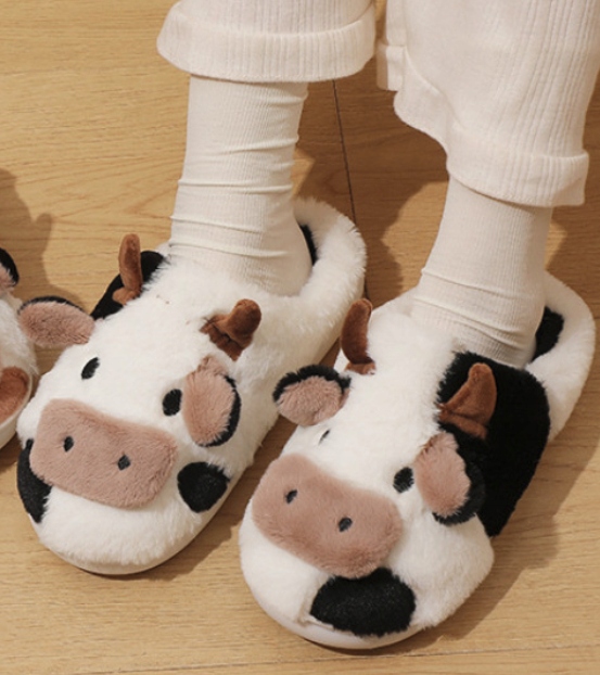 Теплі тапочки з декоративними плюшевими вставками з мотивом корови. Вони зручні та теплі — ідеальні для холодних днів.