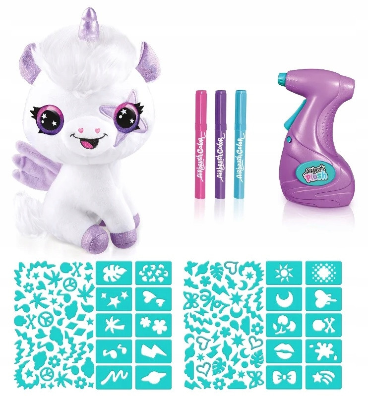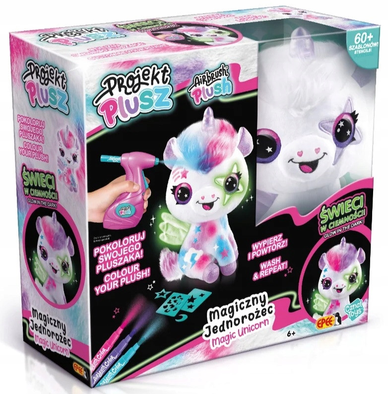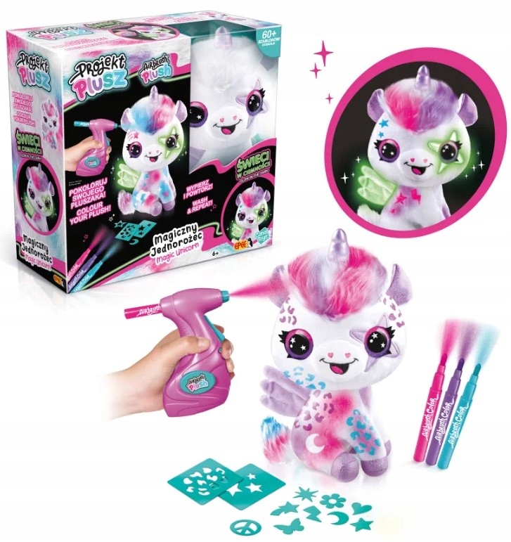 Індивідуалізуйте свого чарівного єдинорога за допомогою фарби-спрей, маркерів і трафаретів. Після гри виперіть плюш і знову почніть його прикрашати. Вимкніть світло в кімнаті, щоб очі та крила Єдинорога світилися.