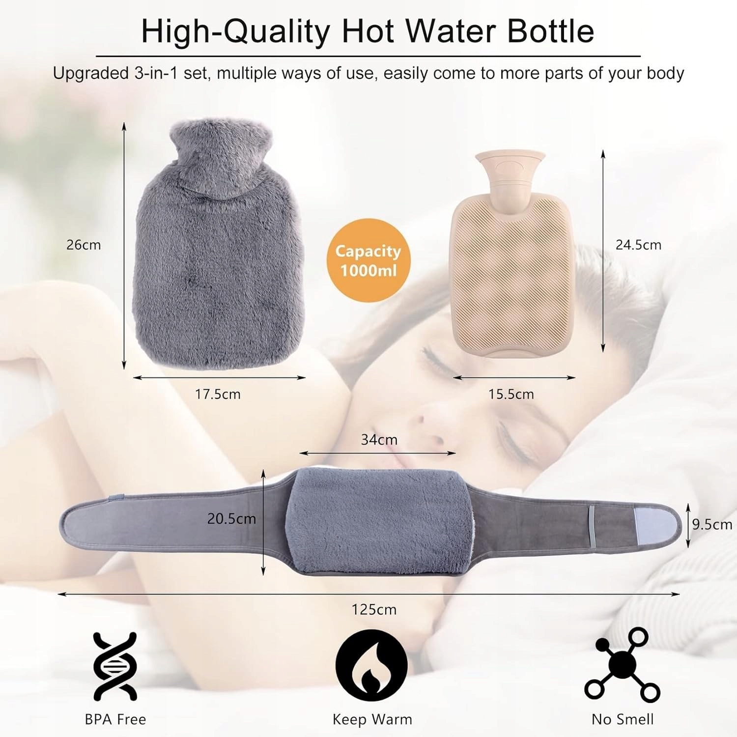 Цей набір включає ремінь і гарячу воду пляшка, яка завдяки гарячій воді забезпечить Вам тепло протягом тривалого часу. Також має м'яку та плюшеву обкладинку. Пухнастий пояс одночасно зберігає тепло рук і попереку, допомагаючи рівномірно розподіляти тепло. Це ідеальний компаньйон для вас і вашої родини під час холодної зими, чудово зігріє руки, поперек, живіт, ноги та ліжко.