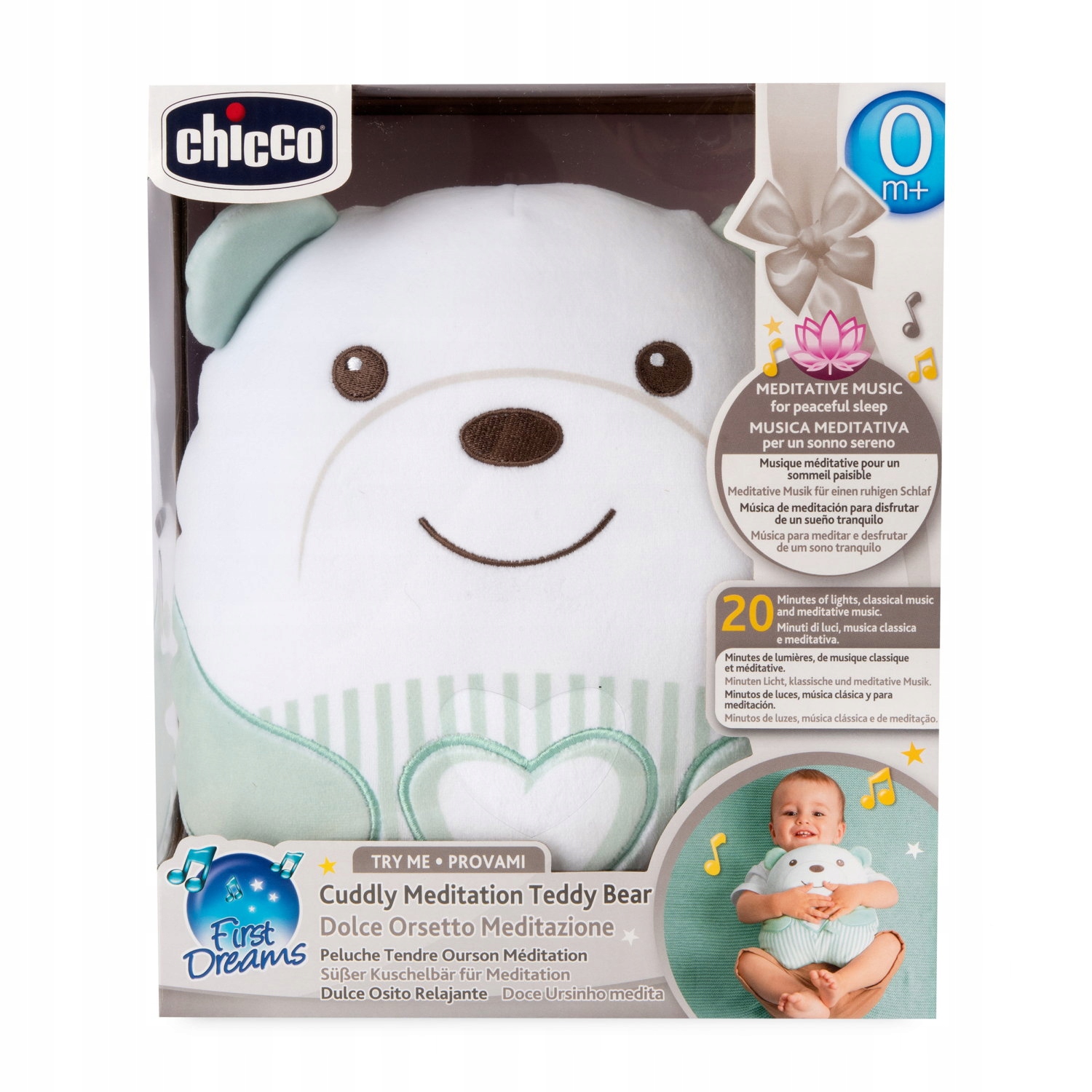 плюшевий ведмедик оснащений 20-хвилинним циклом заспокоєння мелодій , які включають класичні твори відомих композиторів, таких як Моцарт, Бетховен та Офтенбах. Сенсорні здібності. Крім того, завдяки інтерактивній кнопці на животі , малюк може самостійно запускати музику чи світло, що сприяє розвитку рухових навичок та викладає залежності причинно-наслідки.