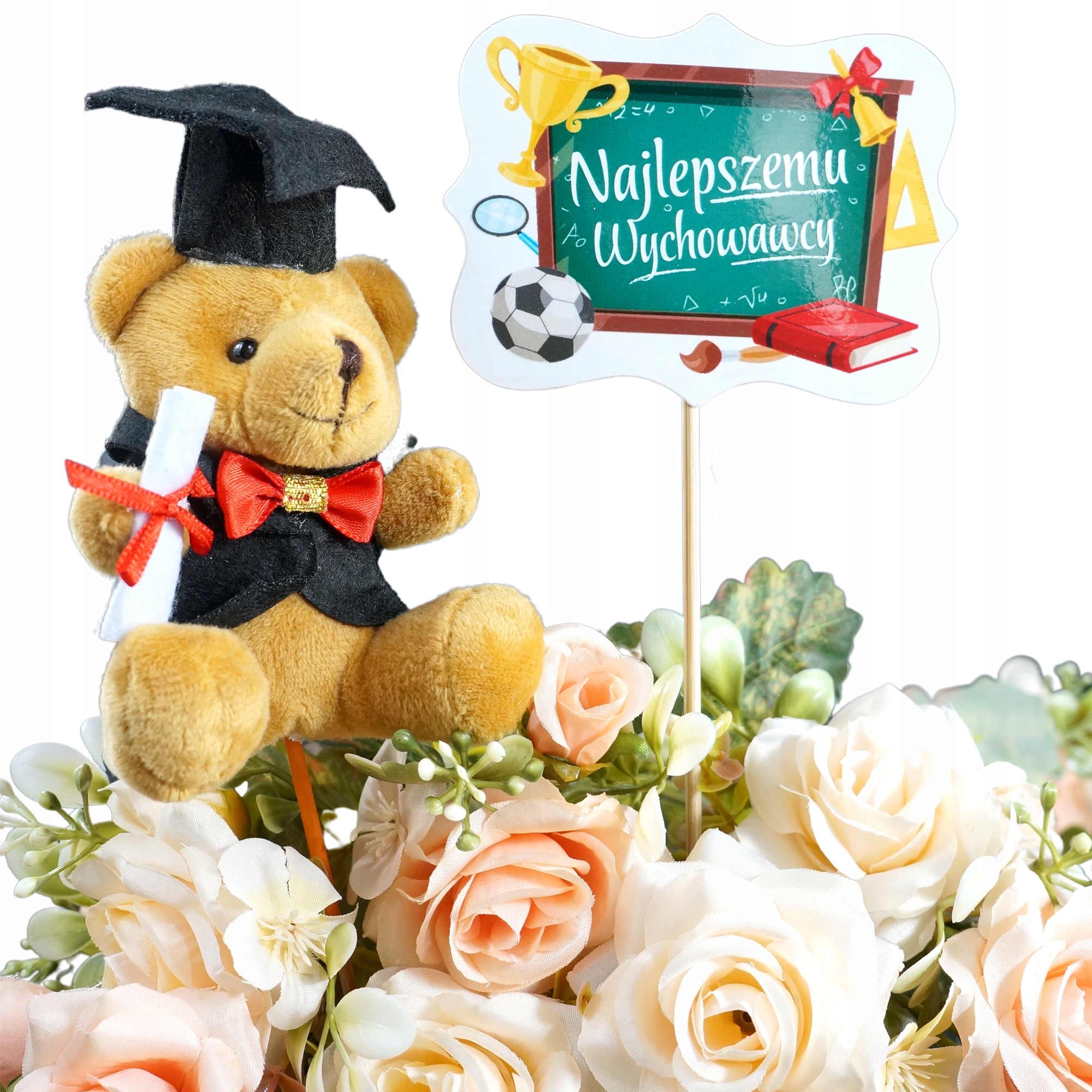 Ефектний ведмедик на козирку ідеально підходить як доповнення до квітів і подарункових наборів до Дня вчителя.