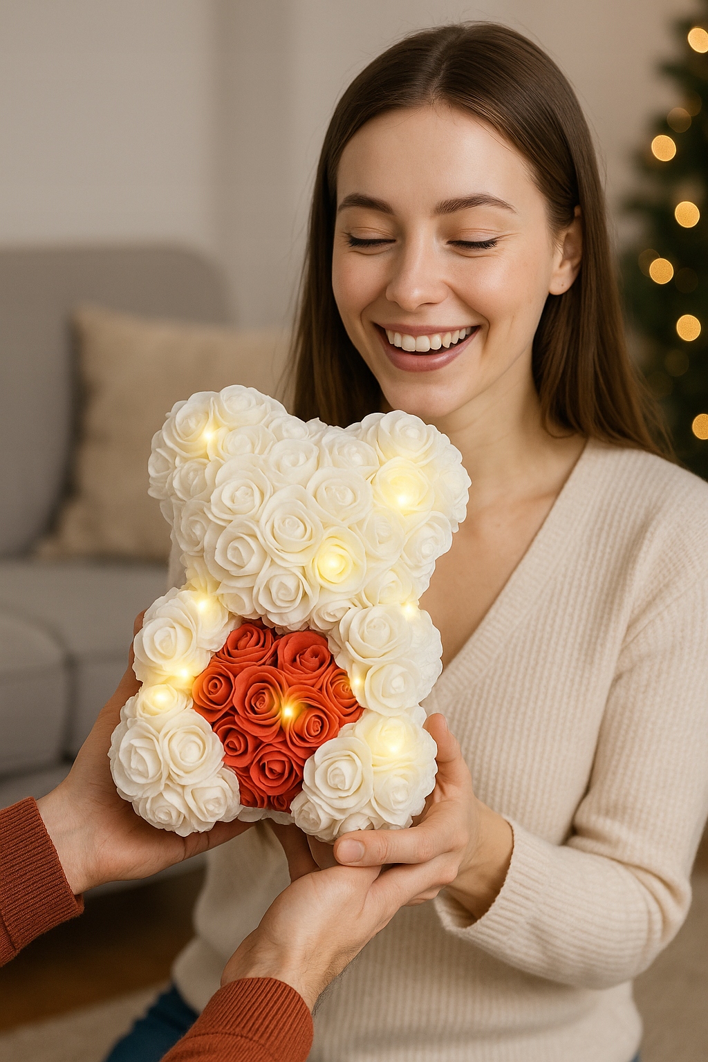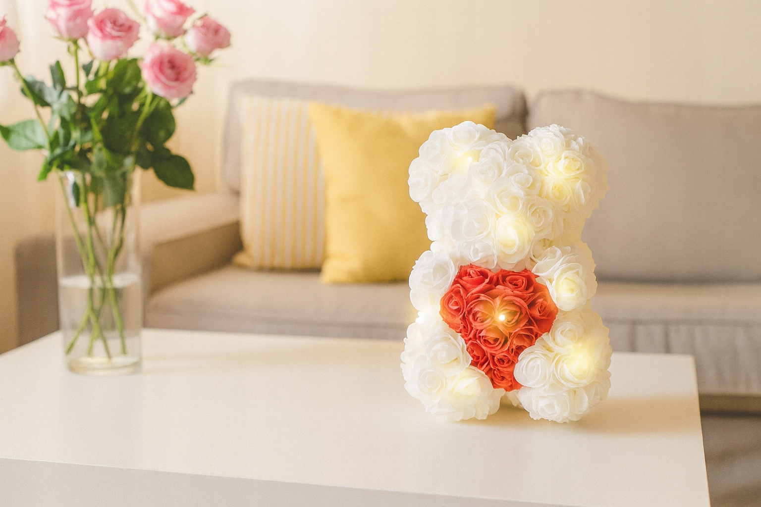 ✅ Елегантний подарунок - унікальний плюшевий ведмедик, виготовлений з червоних, маленьких троянд, тримає біле серце, прикрашене ніжним світлодіодним освітленням.