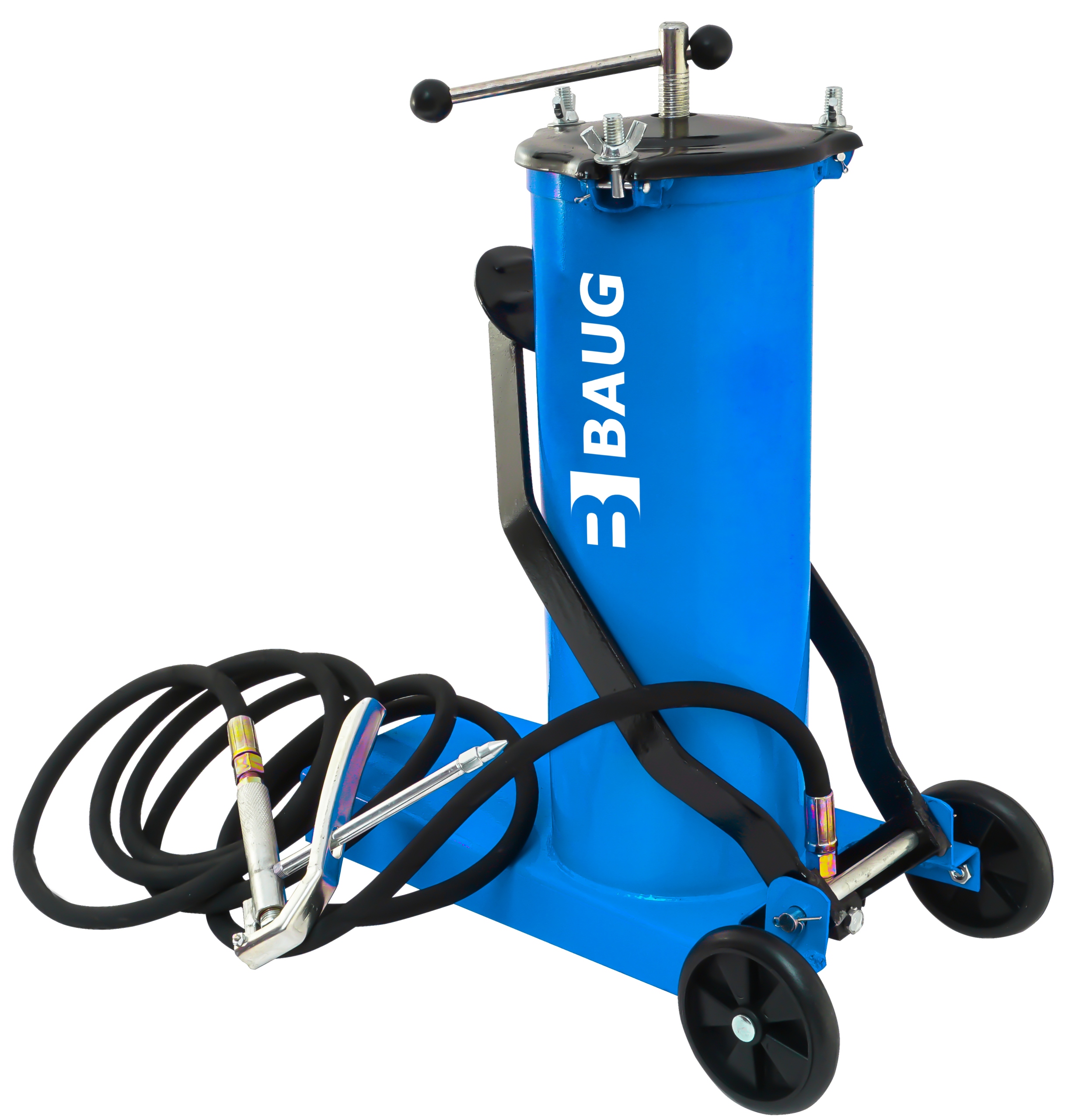 Мастильний пістолет торгової марки BAUG – це пристрій, який використовується для змащування під тиском механічних елементів, таких як вали, штифти, підшипники, з’єднання тощо. виготовлений із сталевого балона ємністю 6 л, що забезпечує безперервну та ефективну роботу. Все це зроблено з високоякісних матеріалів, стійких до тривалого впливу жиру та масла. Всі ущільнення і клапани виготовлені з найвищою точністю і дозволяють працювати при тиску до 30 МПа. У набір входять два наконечники, жорсткий і гнучкий, які підходять для більшості палиць каламіті. Колеса гарантують мобільність і легкість транспортування.