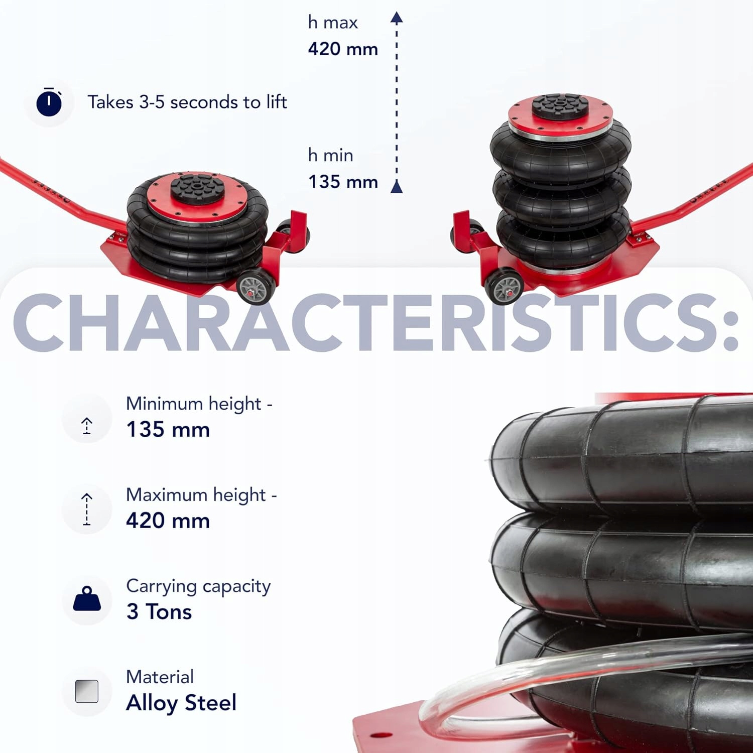 Цей 3-тонний підйомник із трьома відділеннями з компактною та легкою конструкцією забезпечує швидке встановлення. Місткість: 6600 фунтів/3 т. Мінімальна висота: 135 мм. Максимальна висота: 420 мм. Підйом займає всього 3-5 секунд. Наш трикамерний домкрат — це найшвидший спосіб підняти ваш автомобіль.