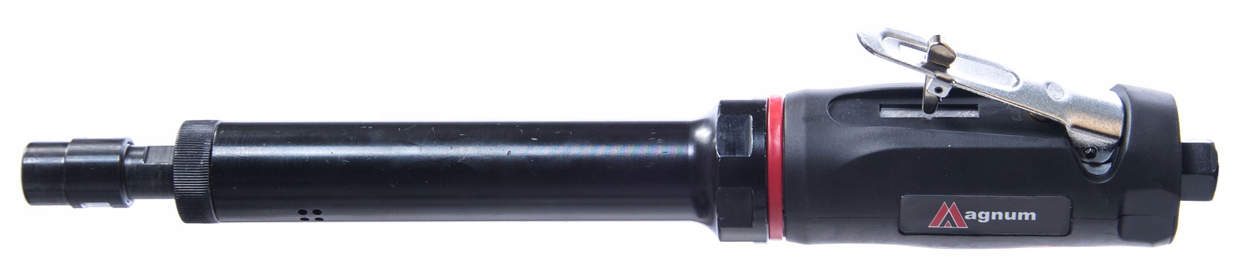 Пневматична шліфувальна машина MAGNUM. Незамінний інструмент для кожного зварника, слюсаря, механіка та сервісного техніка. Додатковою перевагою болгарки є подовжений робочий хвостовик, що дозволяє працювати у важкодоступних місцях. Може працювати з камінням і торцевими фрезами (напилками) діаметром 6 і 8 мм. Ергономічної форми. Спусковий гачок оснащений фіксатором для запобігання випадкового спрацьовування. Вихід повітря розташований на задній панелі пристрою.