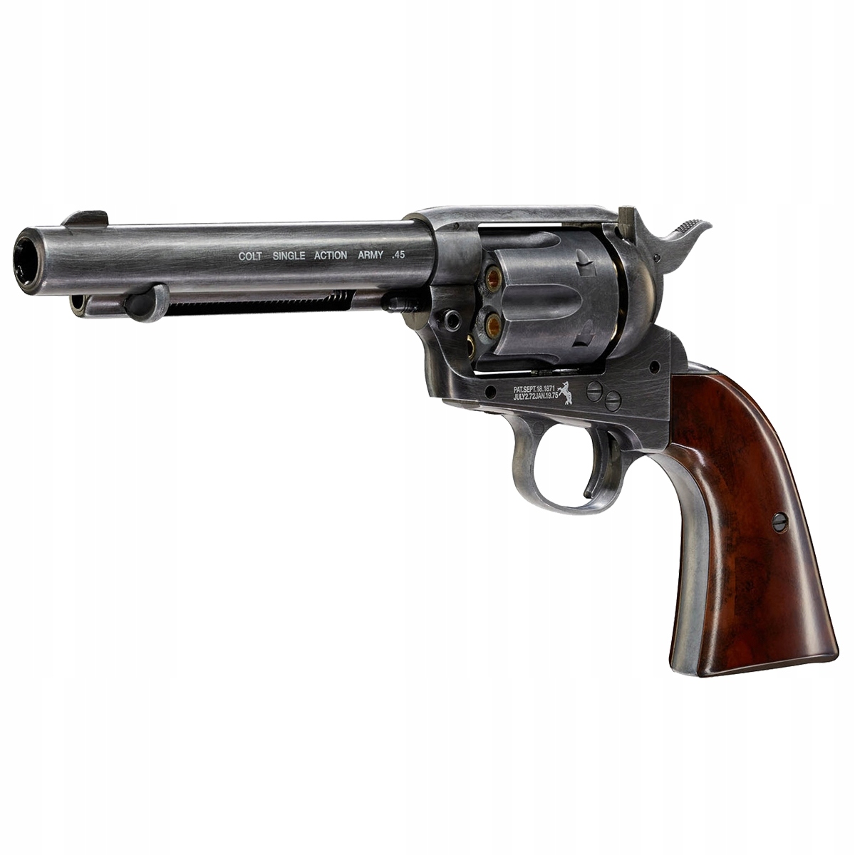 Пневматичний револьвер Colt Peacemaker Single Action Army .45 Antique – це точна металева копія, виготовлена німецькою компанією Umarex. Ця версія характеризується стволом діаметром 5,5 дюйма. Пневматична зброя живиться від 12-грамової капсули CO2, якої достатньо для приблизно 50-60 пострілів. 4,5-мм кулі BB вставляються в гільзи, які потім окремо завантажуються в 6- дробовик.барабан,що додає реалістичності.Револьвер стріляє тільки в режимі Single Action,тобто ручним зведенням курка.Замок захищає від неконтрольованої стрільби.Зброя виготовлена з антикварного металу.