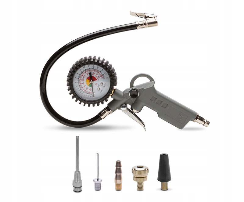 Пістолет з точним манометром дозволяє швидко накачувати різні типи коліс, матраців і м’ячів. У набір входить 5 різних наконечників, які пригвинчуються до пістолета, які дозволяють качати різні типи об'єктів в залежності від клапана. Манометр, прикріплений до пістолета, точно вказує тиск повітря всередині об’єкта, який надувається, дозволяючи вам отримати точну кількість атмосфери відповідно до ваших потреб.