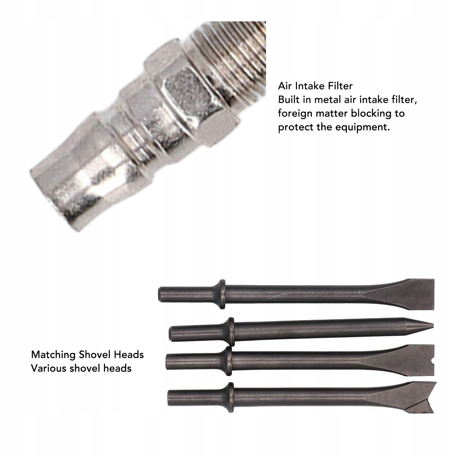 1. [Багатофункціональний набір пневматичних зубил] Оснащений чотирма насадками для зубил, цей пневматичний молоток відповідає різноманітним вимогам, підвищуючи ефективність роботи, заощаджуючи час і зусилля. 2. [Ергономічна ручка] Ергономічна ручка набору пневматичних зубил зменшує вібрацію, підвищує комфорт під час роботи та допомагає ефективно виконувати завдання. 3, [Міцний і міцний] Завдяки трубі з легованої сталі та термічно обробленому поршню повітряне долото створене таким чином, щоб витримувати суворі умови, часті падіння та вплив хімічних речовин. 4, [Розширені функції] Пневматична лопата має додаткові функції, такі як дифузна ручка вихлопу, регулятор потужності та професійний сенсорний тригер для зручності. 5, [універсальний] Пневматичне зубило підходить для різання металевих панелей, кріплення вихлопних систем, шкряблення поверхонь, зйомки та виконання кузовного ремонту автомобіля.