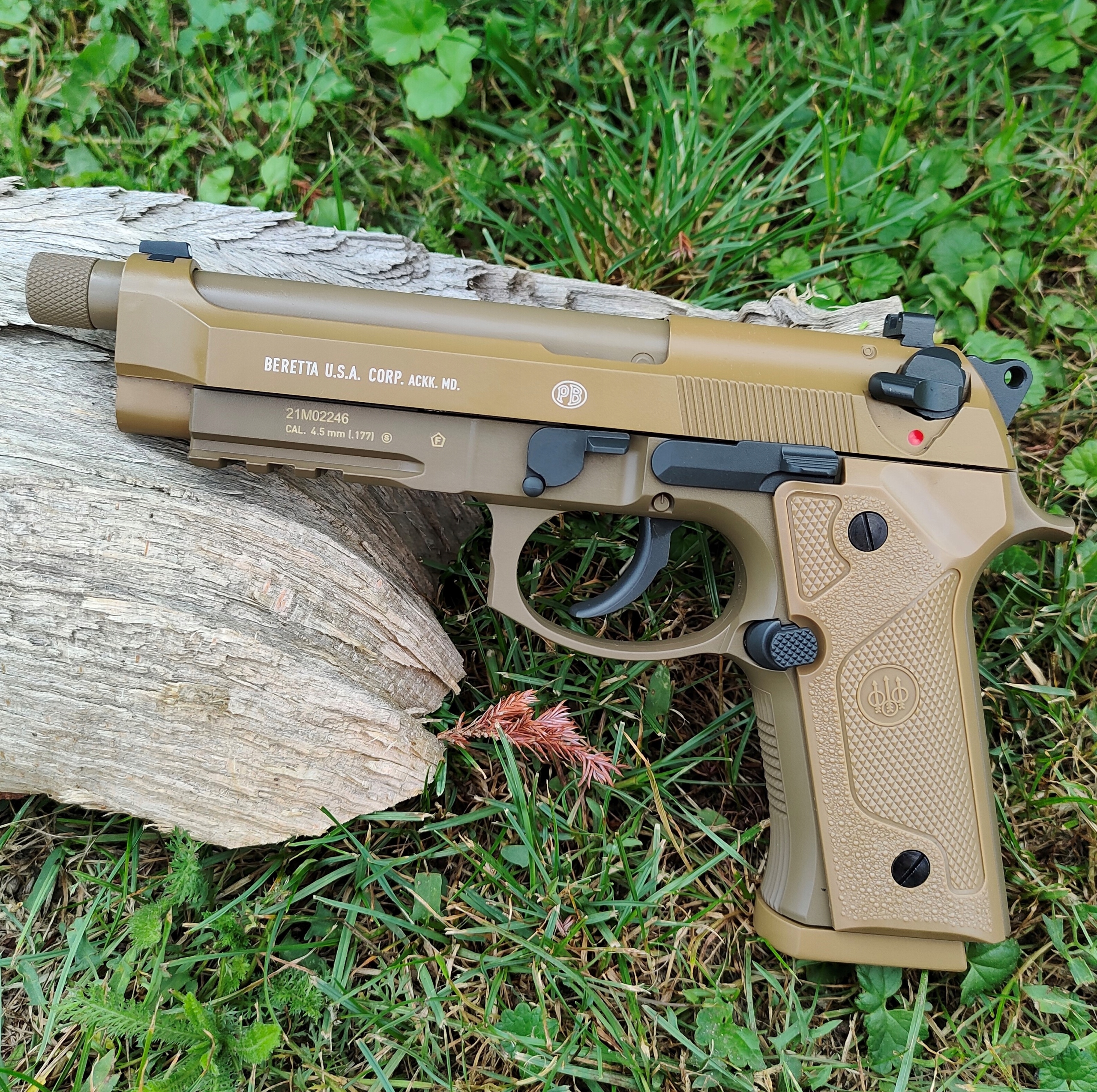 Beretta M9 — це військова пневматична зброя з металевою конструкцією в кольорах FDE, з потужною системою віддачі затвора та реалістичною ручне управління.