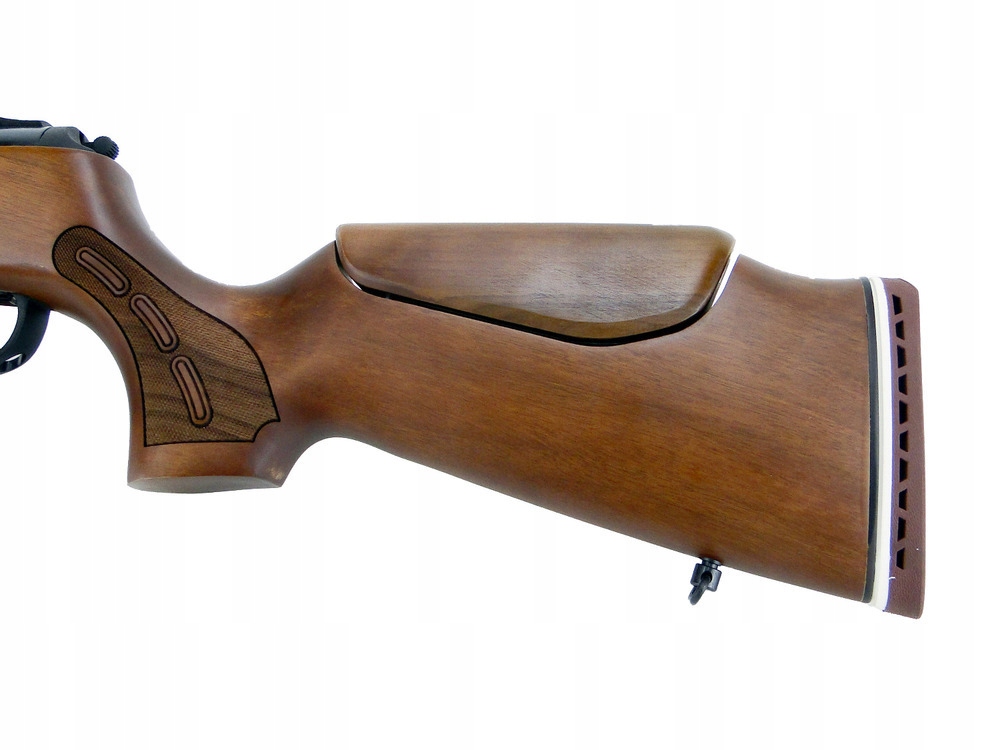 Дерев'яний приклад з пазами, профільований для правшів і лівшів, має регульовану висоту щокової подушечки, завдяки якій ми можемо зручно розташуватися під відкритими прицілами та оптикою.