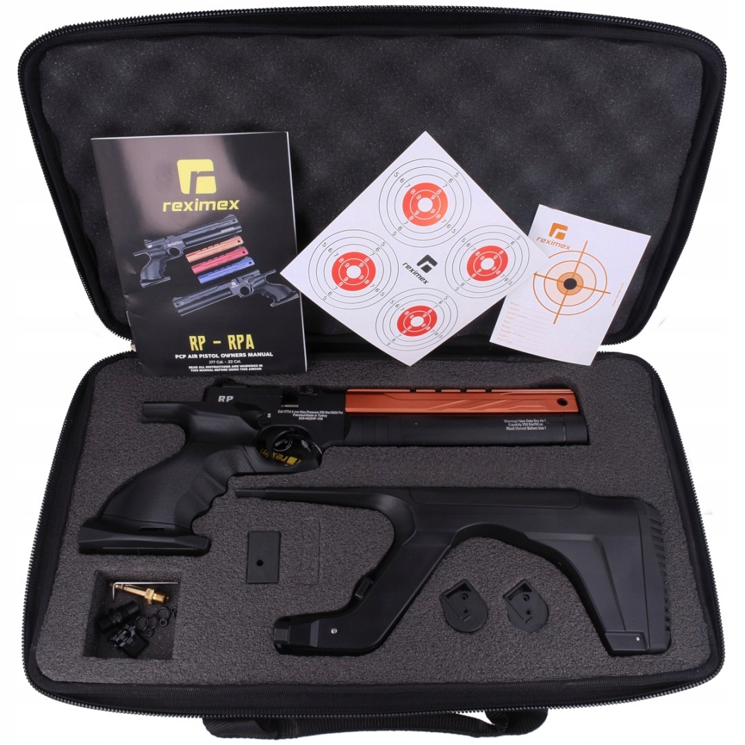 Reximex RP Copper Red — точний багатозарядний спортивний пістолет PCP із мідно-червоним замком і регулятором, що дозволяє повторювати постріли. Оснащений регульованим ціликом і регульованим спусковим гачком і напірним бакомоб'ємом 50 куб.см. Анатомічна ручка з поличкою з можливістю кріплення приклада.
