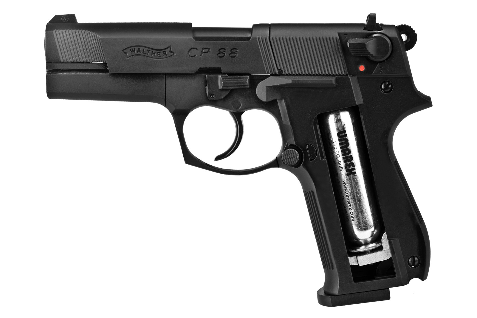 Walther CP88 є точною копією WALTHER P88, класичного пістолета з групи особистої зброї. Виготовляється повністю з металу, а накладки ручок виготовляються з пластику або дерева. Це репліка преміум-класу, виконана з великою увагою до деталей. Замість цілика можна встановити червоний крапковий приціл - за допомогою спеціальної планки. Капсула CO2, встановлена в ручці. Двосторонній запобіжник крила дозволяє керувати рушницею як лівшам, так і правшам. Профілі ручки забезпечують стабільне захоплення пістолета під час стрільби.