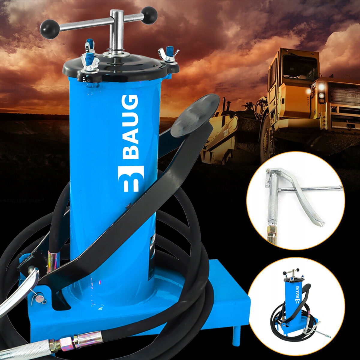 Ножний мастильний пістолет BAUG – це пристрій, який використовується для змащування під тиском механічних елементів, таких як вали, штифти, підшипники, шарніри тощо. сталевого балона ємністю 3 л, що забезпечує безперервну та ефективну роботу. Все це зроблено з високоякісних матеріалів, стійких до тривалого впливу жиру та масла. Всі ущільнення і клапани виготовлені з найвищою точністю і дозволяють працювати при тиску до 30 МПа. У набір входять два наконечники: жорсткий і гнучкий, які підходять для більшості палиць каламіті.