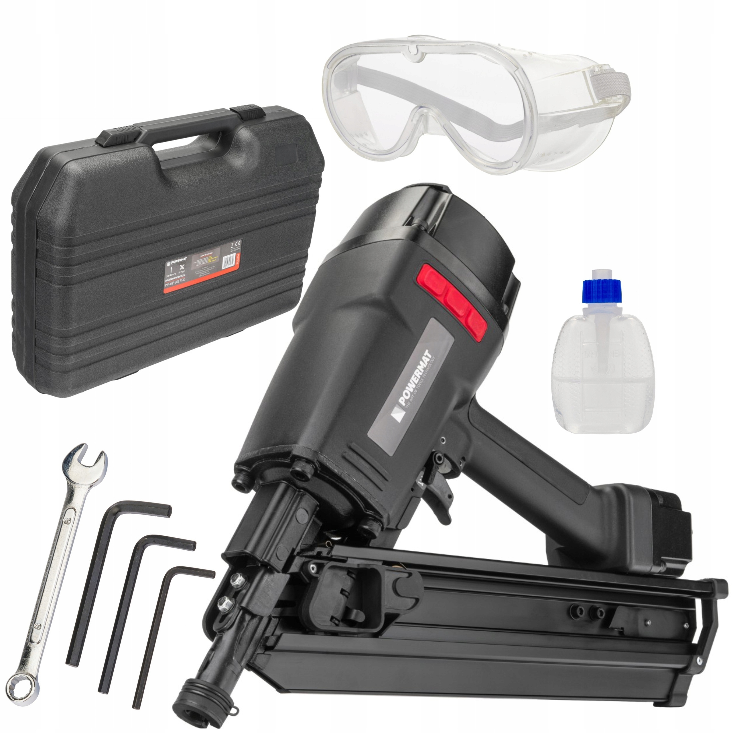 - Стрічковий гвоздильник PM-GP-80T PRO для цвяхів, з’єднаних папером під кутом 34°, довжиною від 55 до 90 мм, призначений для легких, напівпрофесійних і домашніх робіт.