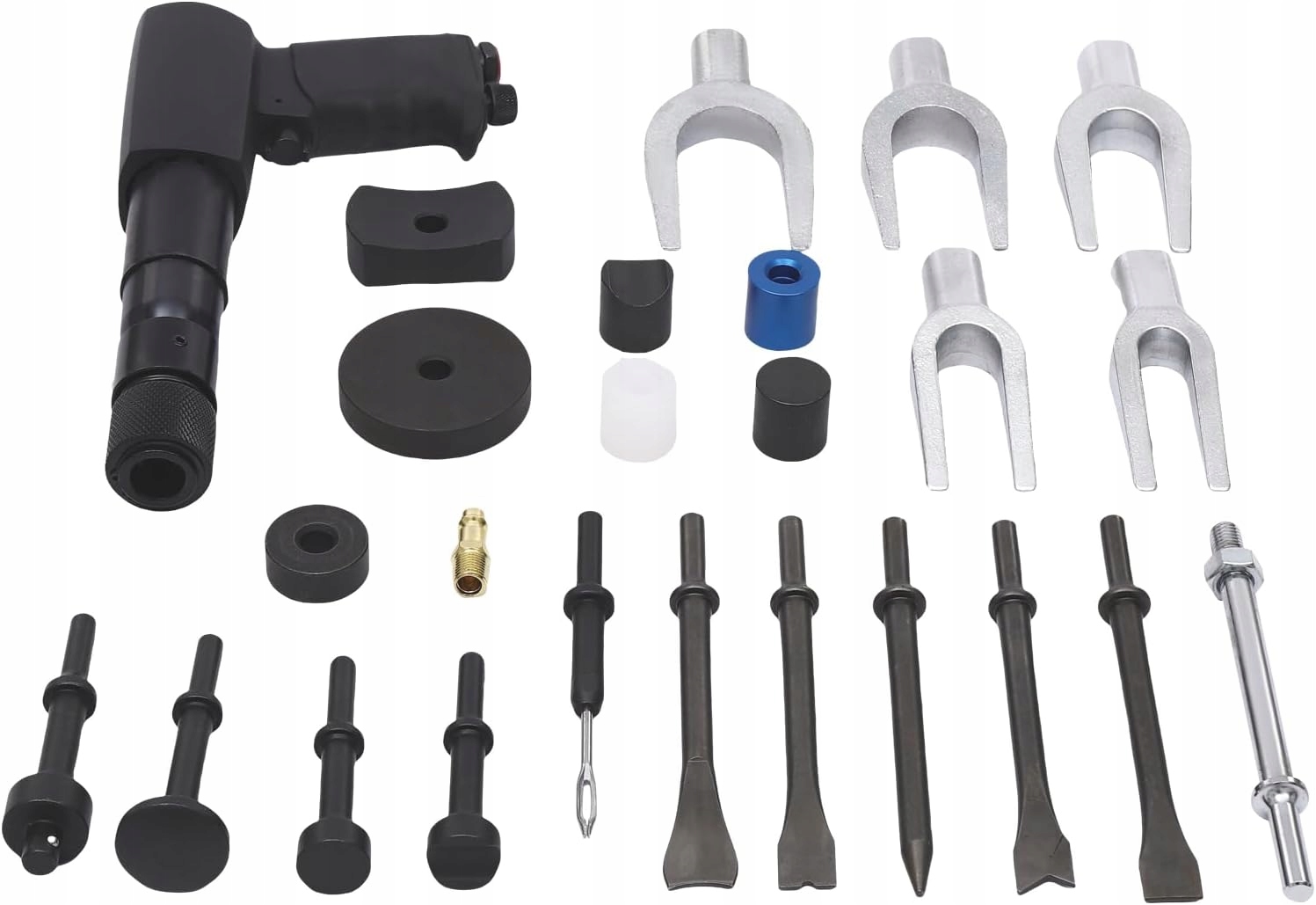 Великий набір адаптерів, призначених для послаблення заблокованих з’єднань за допомогою вібрації, спричиненої пневматичним молотком, що входить до комплекту.