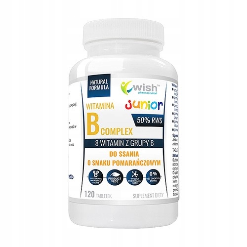 Вітамін В комплекс молодших 50% RWS - це продукт дієтичної добавки, призначений для дітей старше 10 років. Помаранчевий смак. Продукт без додавання цукру, без солі, без глютену, без крохмалю, без штучних наповнювачів. Підходить для вегетаріанців та веганів.