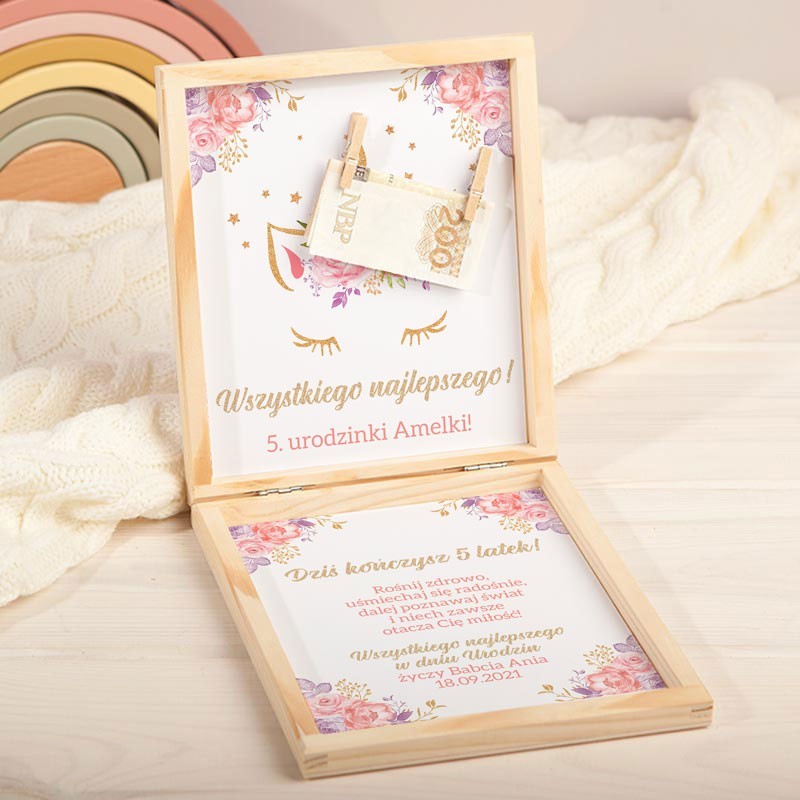 - принт: всередині коробки приклеєні дві картки: на одній затискачі для грошей або фото, а також графіка та персоналізація, а на іншій побажання, підпис і красива графічний мотив єдинорога та квітів