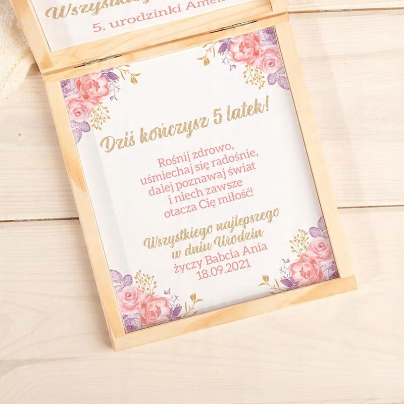 - склад: іменна листівка з днем народження в коробочці і одночасно красива скарбничка; в якому є дві персоналізовані картки з зображеннями та побажаннями, а також дерев’яні кліпси для фото чи грошей