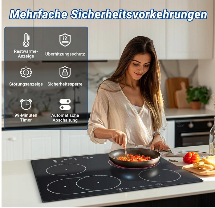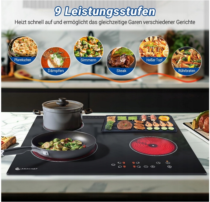Про цю керамічну скляну тарілку з цим продуктом 4 зони: чотири зон приготування можуть діяти окремо, не порушуючи один одного. Подвійна зона (1000/2200 Вт) може вмістити більші горщики та каструлі, що значно скорочує час приготування. Овальна зона (1100/2000 Вт) розміщує овальні або прямокутні горщики та каструлі, такі як каструлі для гриля, які можна легко використовувати для приготування стейків та на грилі. Точний контроль температури: Керамічна пластина Amzchef скла має загалом 9 рівнів потужності, користувачі можуть регулювати його відповідно до власних потреб, ви можете ретельно регулювати температуру в потрібному діапазоні. Він відповідає різним кулінарним потребам, такими як пари, спалювання, смаження, смаження під час перемішування, грилю та приготування води. Сенсорний дисплей можна легко працювати одним дотиком пальця без необхідності складних кнопок управління. Багато гарантій безпеки: Керамічна скляна тарілка забезпечує безпечне, зручне та швидке приготування їжі. Він забезпечує багато функцій безпеки, таких як 99-хвилинний таймер, захист від перегріву, автоматичне вимкнення, залишкове попередження про тепло та блокування безпеки. Керамічна плита не генерує електромагнітне випромінювання, її також можуть використовувати вагітні жінки, навколишнє середовище та здоров'я! 【Ідеально підходить для різних кухонних начиння. Розміри Опис: Розмір продукту: 590 х 520 х 50 мм, розмір отвору: (562 ~ 564)*(490 ~ 492) мм. *Теплі поради: цей продукт повинен бути підключений та експлуатуватися без плагіна