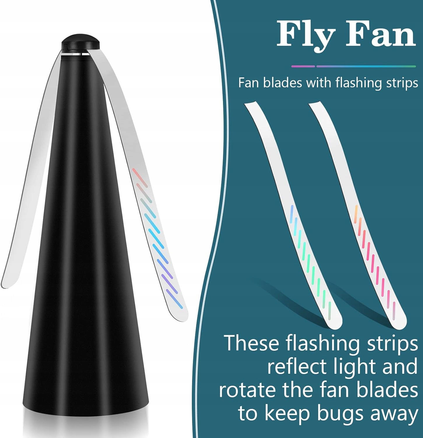 - 【Як це працює】: Відомо, що мухи а інші комахи бояться рухомих предметів і спалахів світла. Обертові лопаті вентилятора та світловідбиваючі смуги на лопатях вентилятора захищають їх від контакту з їжею.