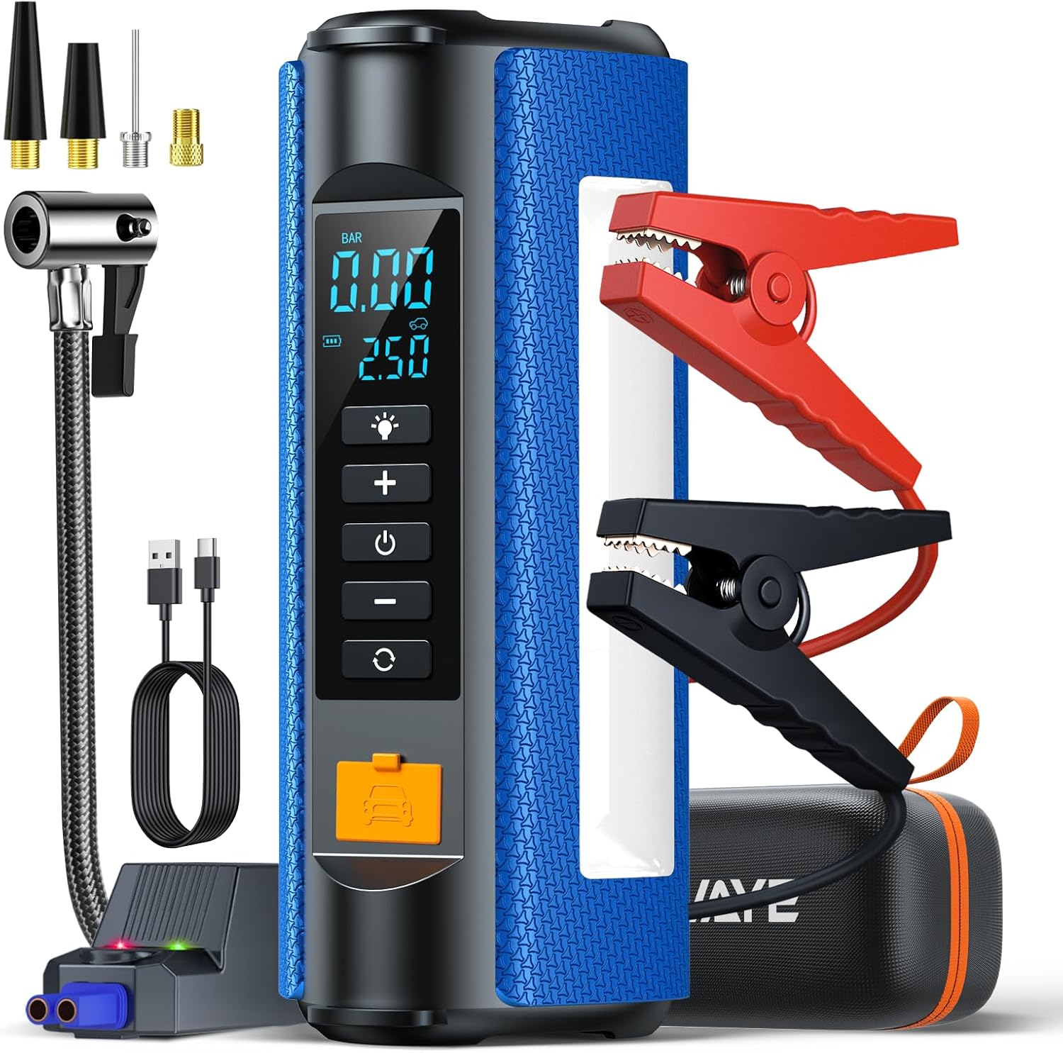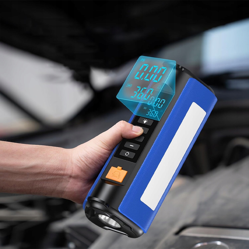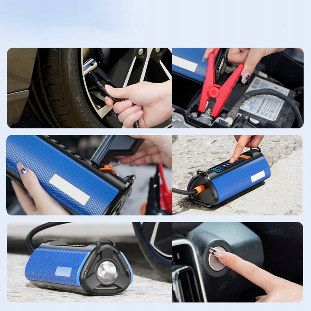 - Портативний повітряний компресор має піковий струм 2000 А і може запустити транспортні засоби з бензиновими двигунами від 12 В до 7,0 л/5,0 л за кілька секунд. Ефективний підсилювач акумулятора автомобіля - до 20 запусків на один заряд (трохи більше 25% заряду достатньо для запуску автомобіля), навіть при екстремальних температурах. Підходить для пасажирських автомобілів, вантажних автомобілів, мотоциклів, транспортних засобів тощо.