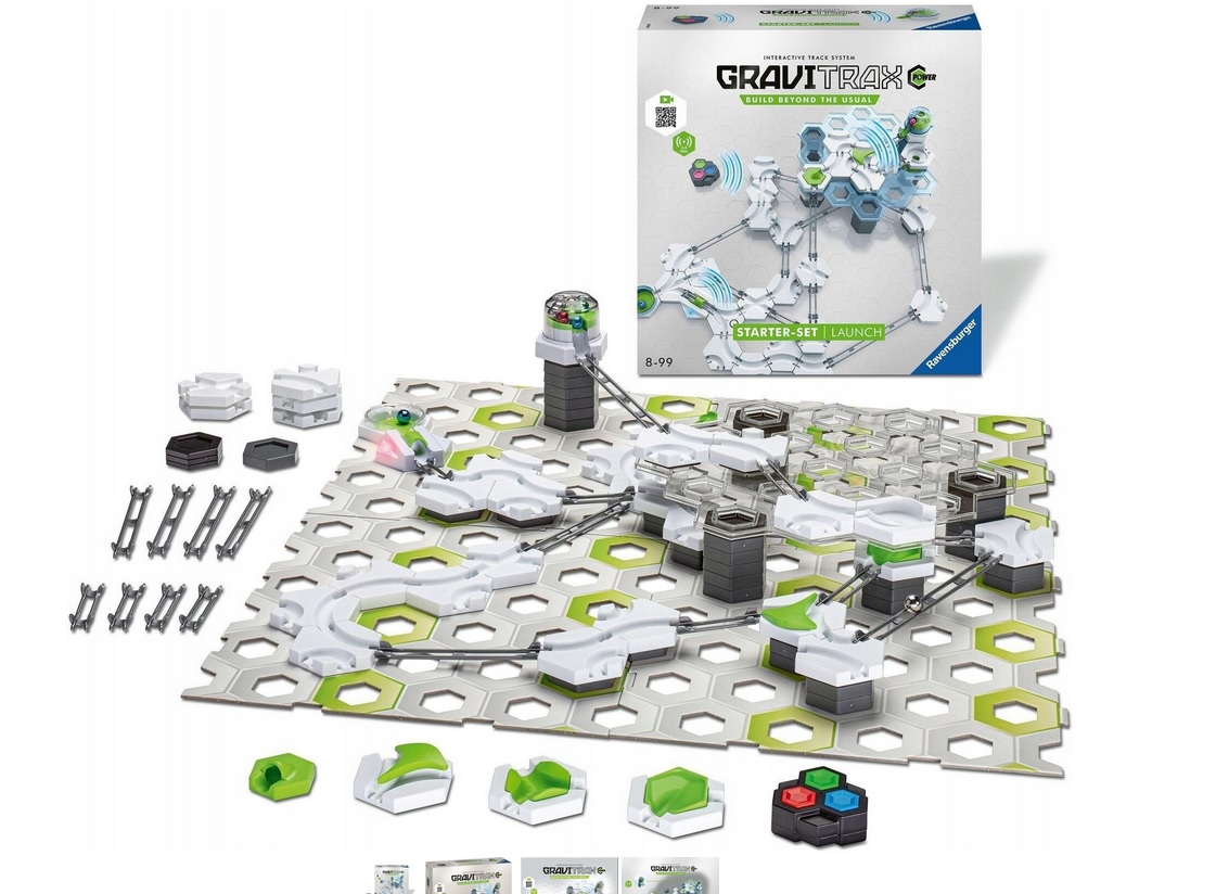 Стартовий набір Gravitrax Power включає додатки «Старт» і «Фініш», які з’єднані між собою за допомогою радіосигналу. Щойно один м’яч закінчує свій біг, надсилається сигнал, а наступний м’яч стартує на доріжці – без рук!