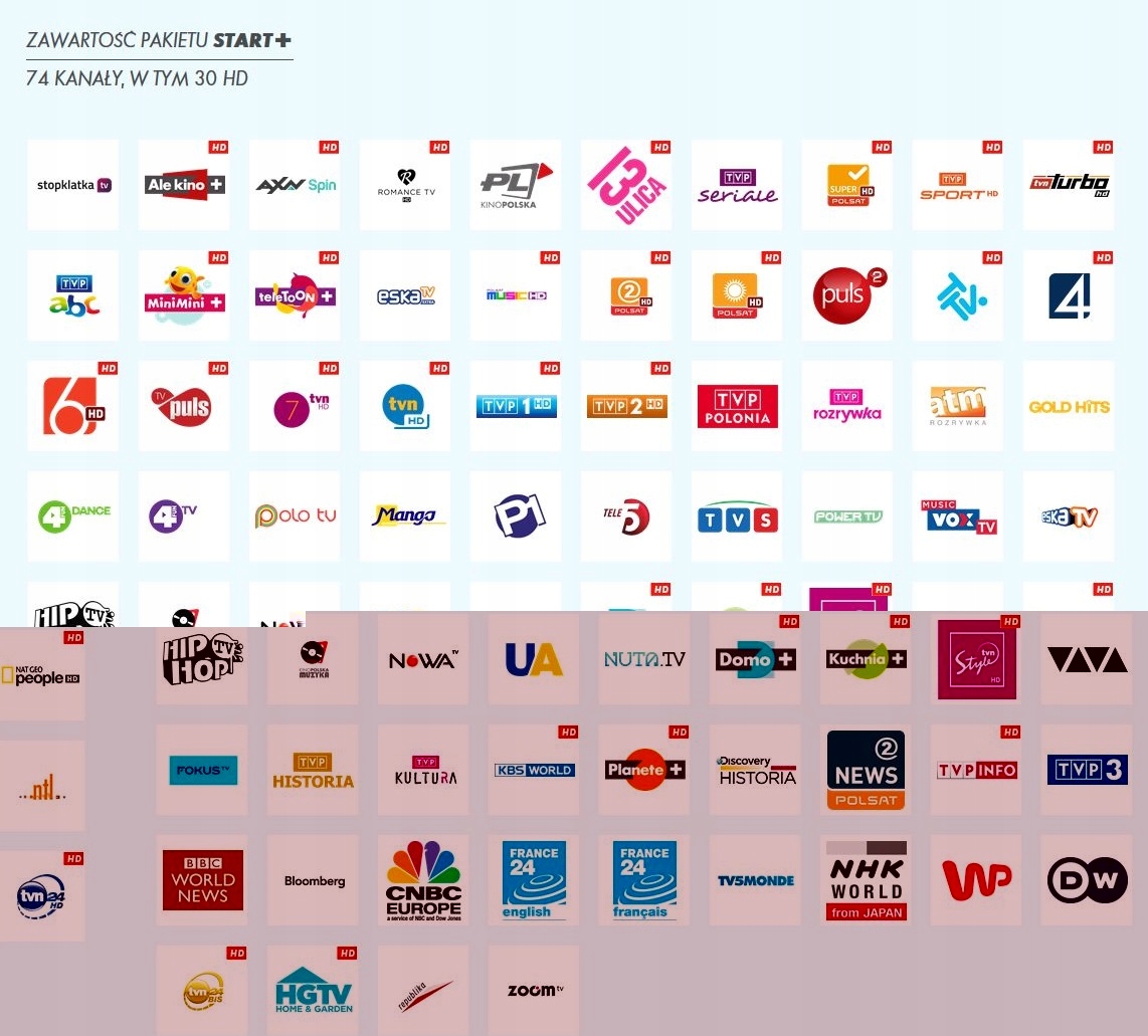STOPKLATKA, ALE KINO+ HD, AXN SPIN HD, ROMANCE TV HD, KINO POLSKA, 13 ULICA HD, TVP SERIES, SUPER POLSAT HD, TVP SPORT HD, TVN TURBO HD, TVP ABC, MINIMINI+ HD, TELETOON+ HD, ESKA TV EXTRA, HGTV HD, POLSAT 2 HD, POLSAT HD, PULS 2, TTV HD, TV4 HD, TV 6 HD, TV PULS HD , TVN 7 HD, TVN HD, TVP 1 HD, TVP 2 HD, TVP POLONIA, TVP ROZRYWKA, REPUBLIKA, GOLD HITS, 4FUN DANCE, 4FUN TV, POLO TV, MANGO 24, POLONIA 1, TELE 5 , TVS, POWER TV, VOX MUSIC TV, ESKA TV, TVN 24 HD, TVN 24 BIS HD, NOWA TV, UA, NUTA.TV, DOMO+ HD, КУХНЯ+ HD, TVN STYLE HD, VIVA, NAT GEO PEOPLE HD, ФОКУС ТВ , TVP HISTORY, TVP KULTURA , KBS WORLD HD, PLANETE+ HD, DISCOVERY HISTORY, POLSAT NEWS 2, TVP INFO HD, TVP 3, NTL RADOMSKO, BBC WORLD NEWS, BLOOMBERG, CNBC EUROPE, FRANCE 24 ENGLISH, FRANCE 24 FRANCAIS, TV5MONDE, NHK WORLD FROM JAPAN, DW , STARS TV, POLSAT MUSIC HD, ESKA ROCK TV, TO!TV, TBN POLSKA, EURONEWS.