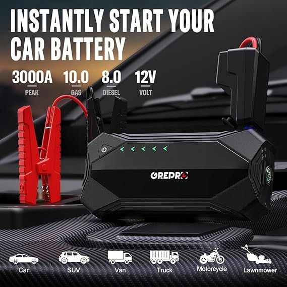 grepro - це ефективний та надійний пристрій для стартера на 12 В, який надасть екстрену допомогу до 50 разів за один заряд. Ідеально підходить для пасажирських автомобілів, мотоциклів, фургонів, снігоходів, косарок та важких машин - підтримує двигуни до 9,0 л (бензин) та 7,0 л (дизель).
