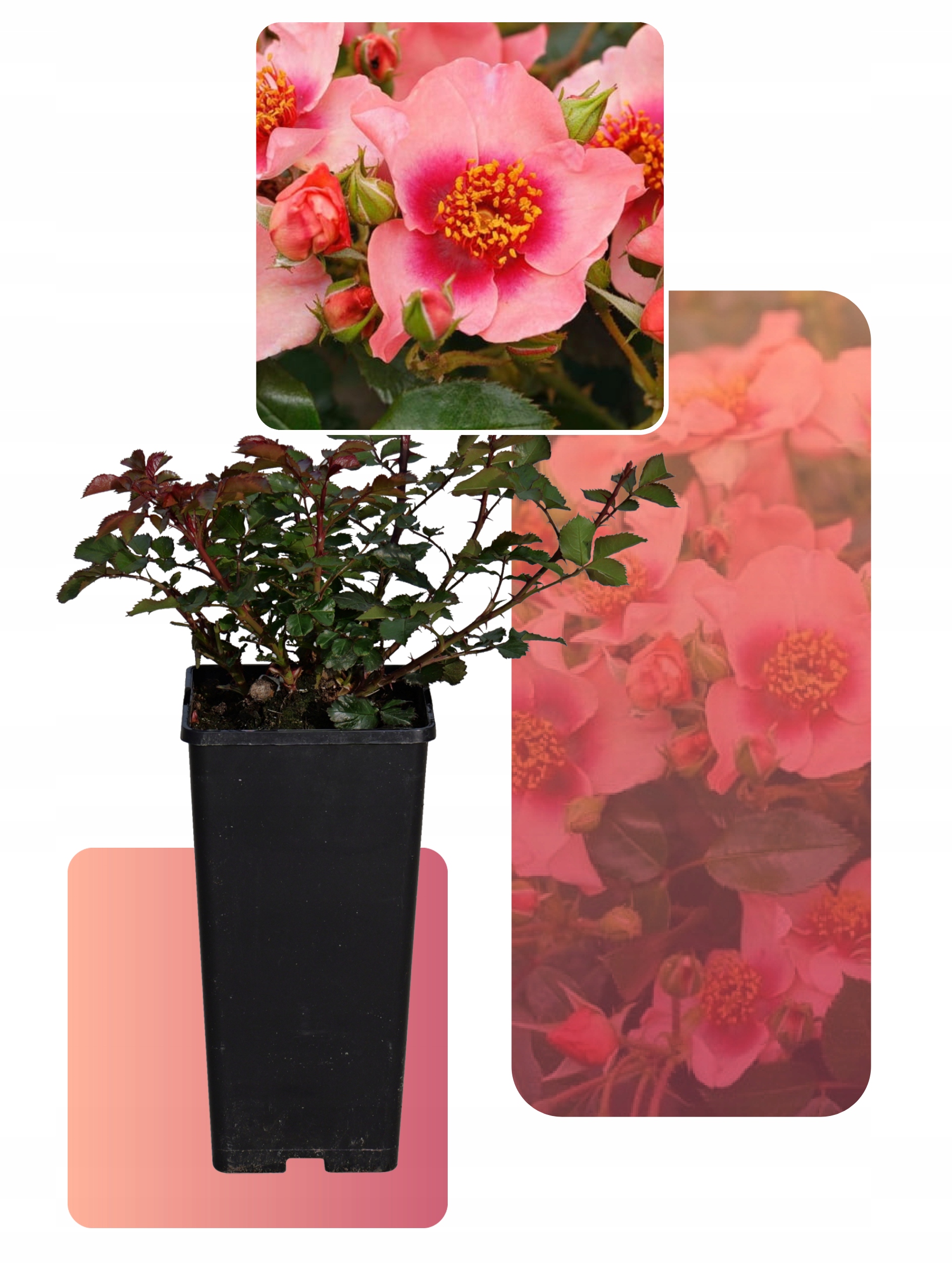 Orienta Shila- - красива, мініатюрна троянда з групи Перських троянд. Вона привертає увагу двома речами. По-перше, дуже компактний, низький, компактний ріст, а по-друге, неймовірна кількість чудових квітів на цьому низькорослому кущику, забарвлення яких в живу навіть гарніше, ніж на фото. Вони мають лососево-помаранчеві пелюстки по краях і інтенсивний малиновий колір в центрі. Крім того, вони чудово контрастують із золотистими тичинками.