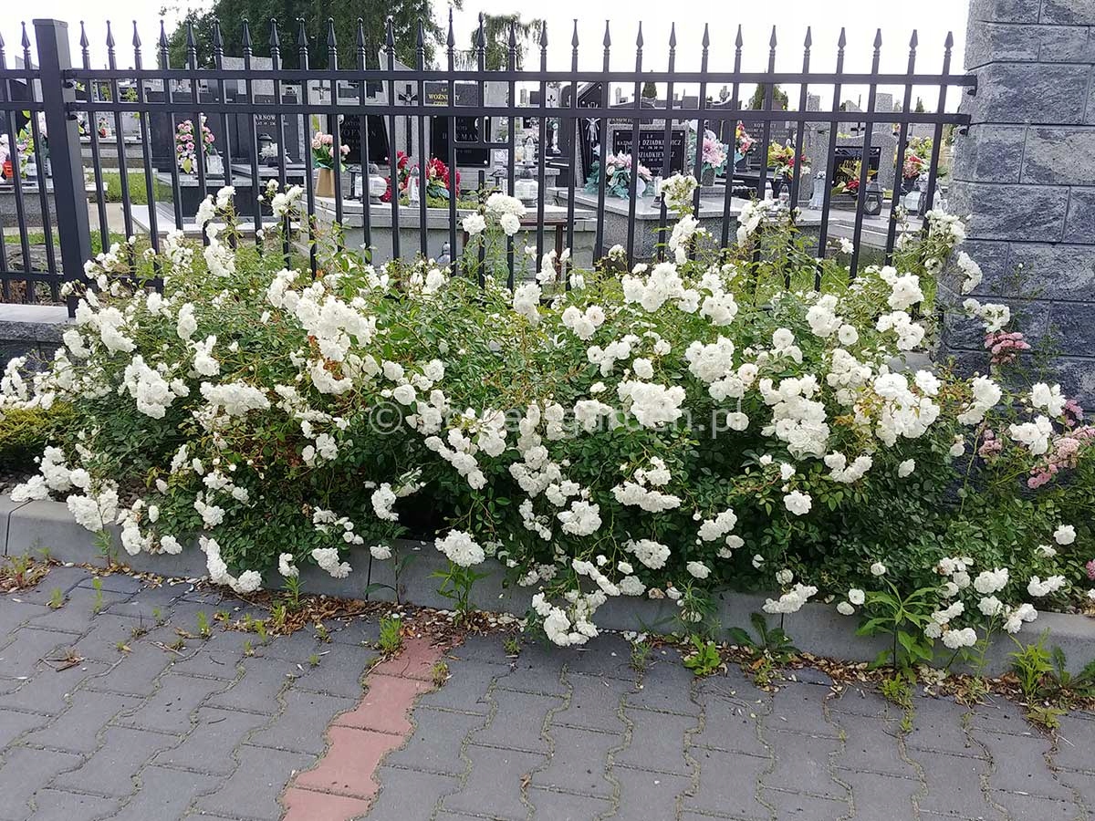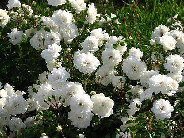 Квітки, повні, запашні, білі з ніжно-кремовим відтінком всередині, близько 4-5 см в діаметрі, зібрані у великі багатоквіткові суцвіття. Рясно цвіте протягом липня, потім повторює цвітіння до пізньої осені,