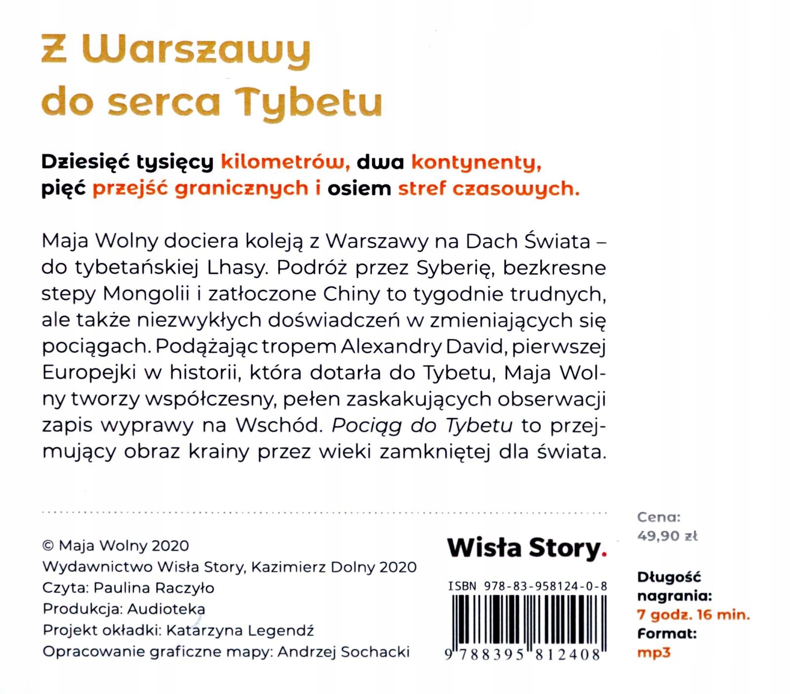 Десять тисяч кілометрів, два континенти, п'ять кордонів і вісім часових поясів. Maja Wolny їде поїздом з Варшави до даху світу – тибетської Лхаси. Подорож Сибіром, нескінченними степами Монголії та багатолюдним Китаєм означає тижні важких, але водночас і надзвичайних вражень під час пересадки. Йдучи слідом Олександри Девід, першої європейки в історії, яка досягла Тибету, Мая Вольні створює сучасний запис своєї експедиції на Схід, повний дивовижних спостережень. «Потяг до Тибету» — це зворушливий образ країни, закритої від світу століттями. Тривалість запису: 7 годин 16 хвилин Формат: mp3