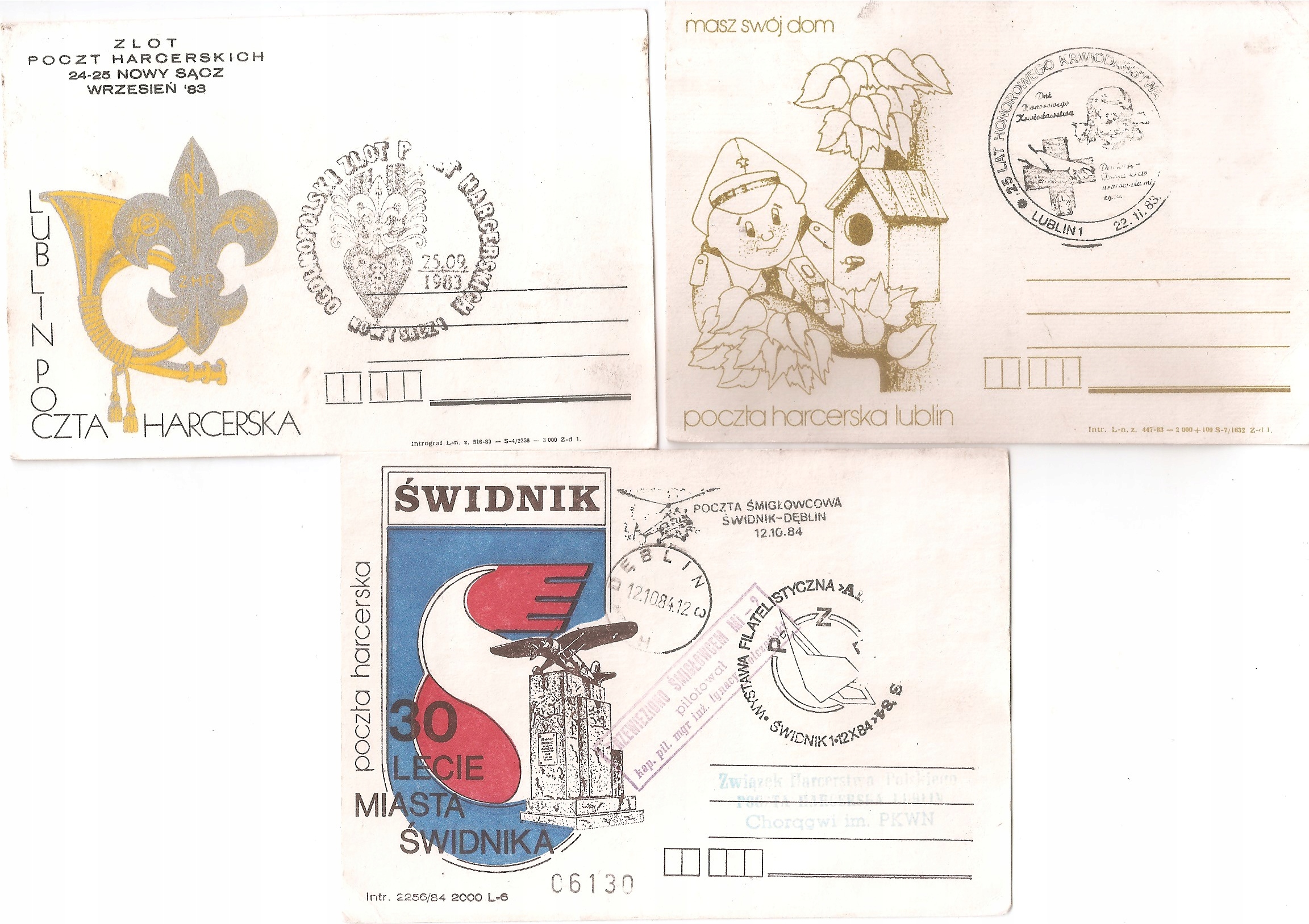 POCZTA HARCERSKA - 3 POCZTÓWKI ZE STEMPLAMI OKOLICZNOŚCIOWYMI Z LAT 80-TYCH