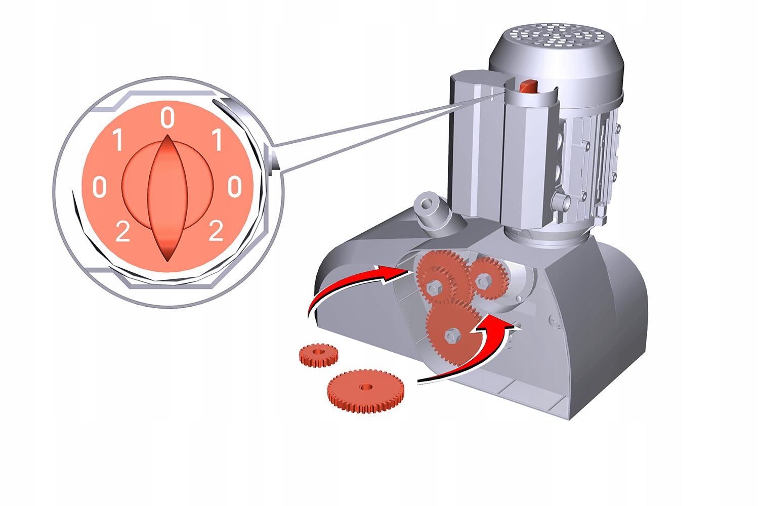 Замінивши внутрішні шестерні, можна отримати 16 різних швидкостей. Крім того, селектор швидкості на двигуні дозволяє швидко встановити першу та другу швидкість подачі та швидко змінити напрямок подачі спереду назад