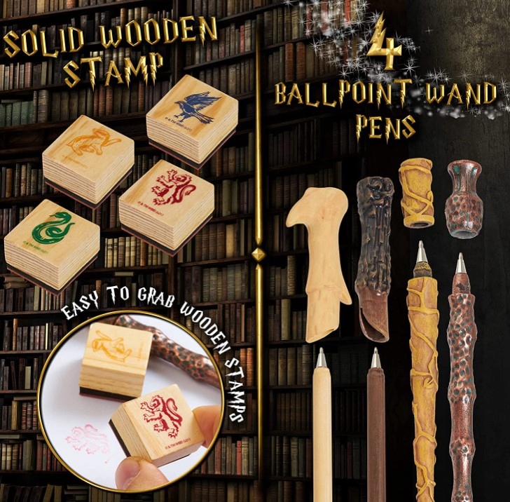 - До комплекту поставки входить: набір ручок із паличками Гаррі Поттера з 4 паличками (чорне чорнило), карта Гаррі Поттера, 4 штампи з чорнилом «Будинки Хогвартса». ul>