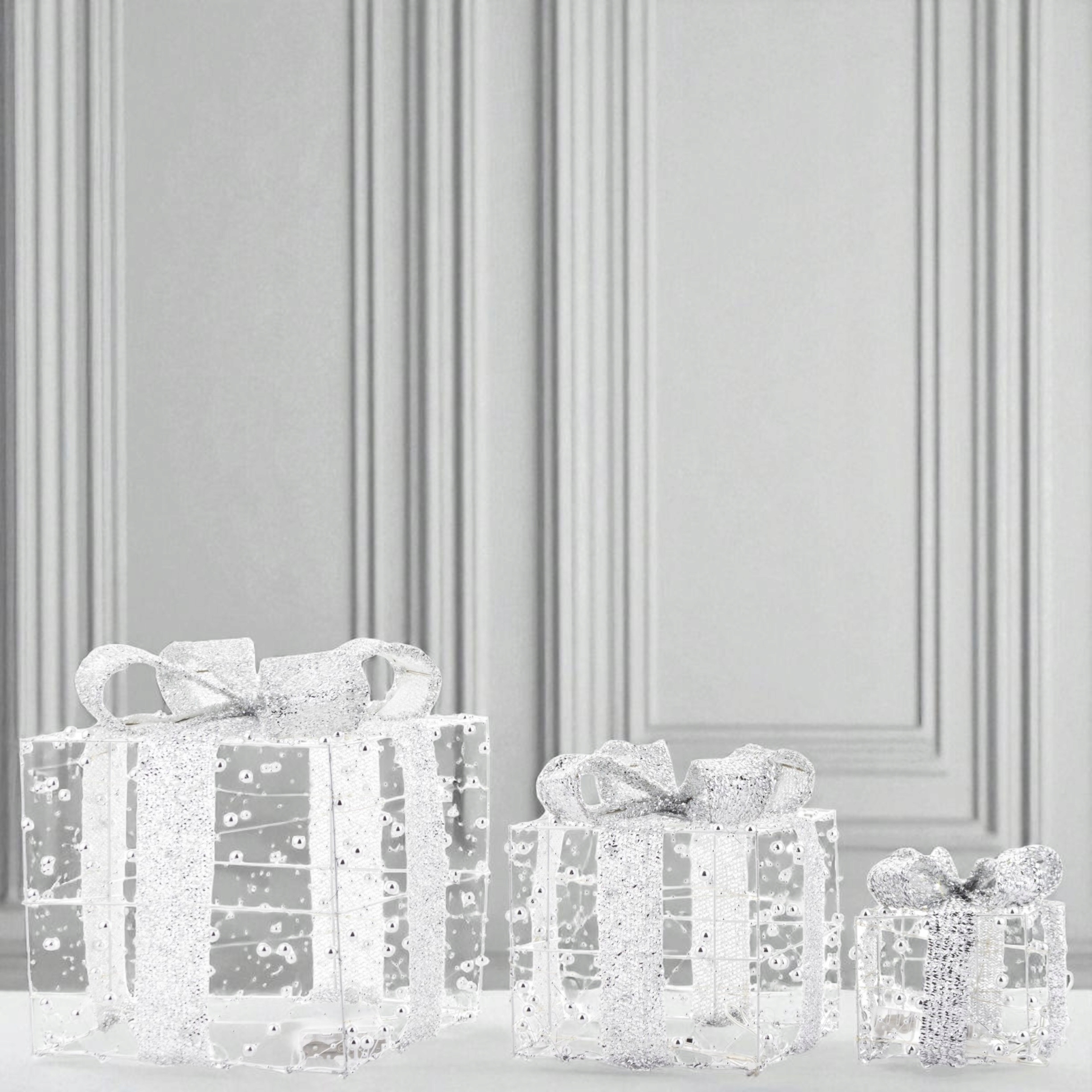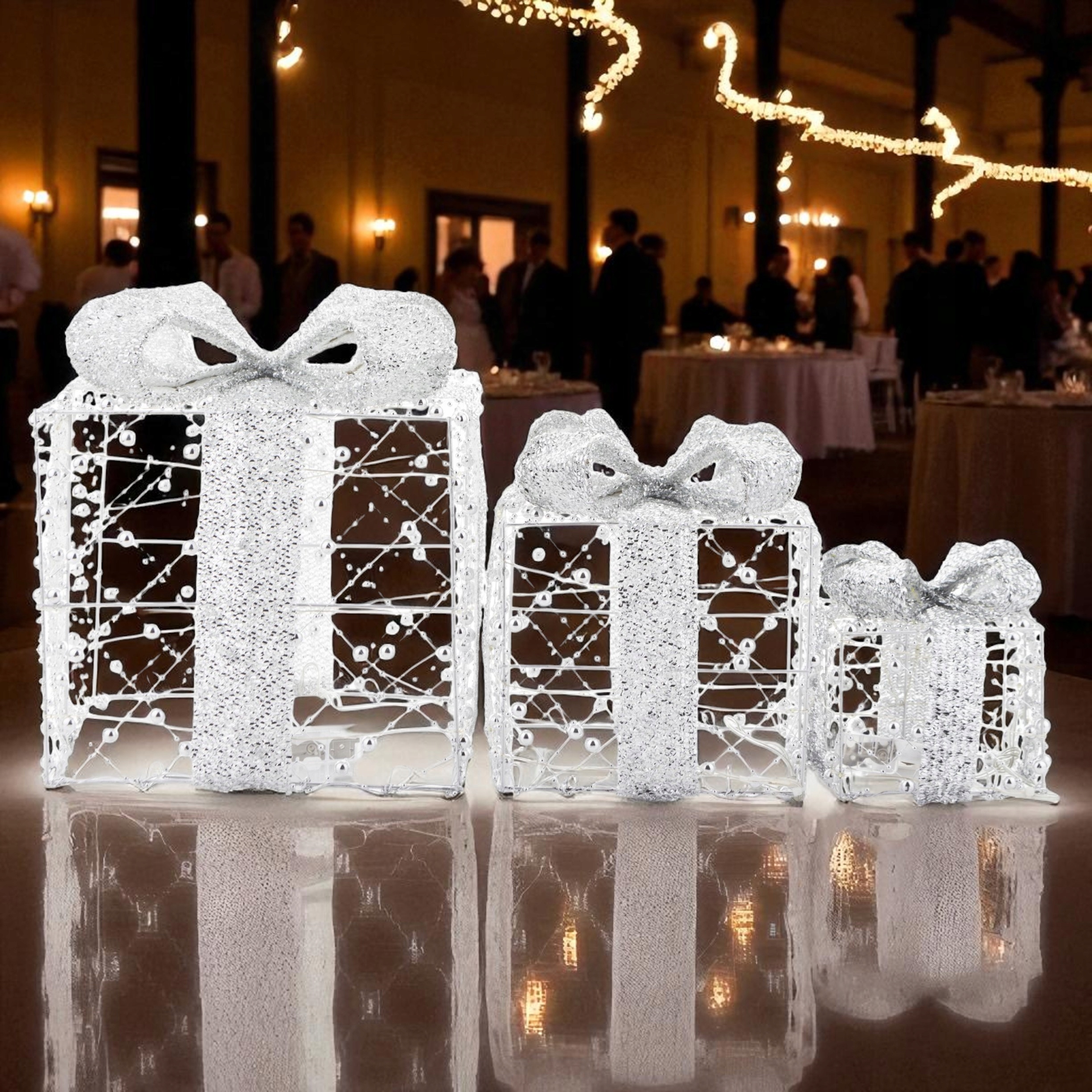 Введіть у свій інтер'єр чарівну різдвяну атмосферу за допомогою унікального набору декоративних світлодіодних подарунків. Легке світло та елегантне сріблясте покриття роблять їх привабливою прикрасою як удень, так і ввечері.