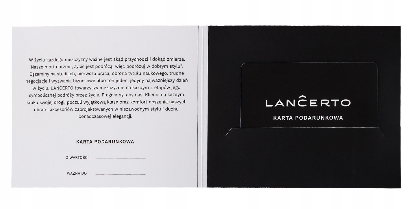 Подарункова карта для використання в магазині Lancerto — чудова ідея подарунка для модного чоловіка, особливо коли ми не можемо визначитися, яку модель чи розмір вибрати, або ми не до кінця знаємо смак людини, яка отримує подарунок. Подарункова картка доступна в чотирьох розмірах: 100 злотих, 300 злотих, 500 злотих або 1000 злотих і дає право придбати весь асортимент товарів, доступний у всіх магазинах Lancerto по всій Польщі. Наші подарункові картки упаковані в елегантну паперову упаковку та мають класичний, вишуканий дизайн із надихаючою присвятою елегантному чоловікові. Свята, дні народження, захист наукової роботи, День батька - незалежно від нагоди - подарункова картка в подарунок - це гарантія ідеального подарунка для близької вам людини!